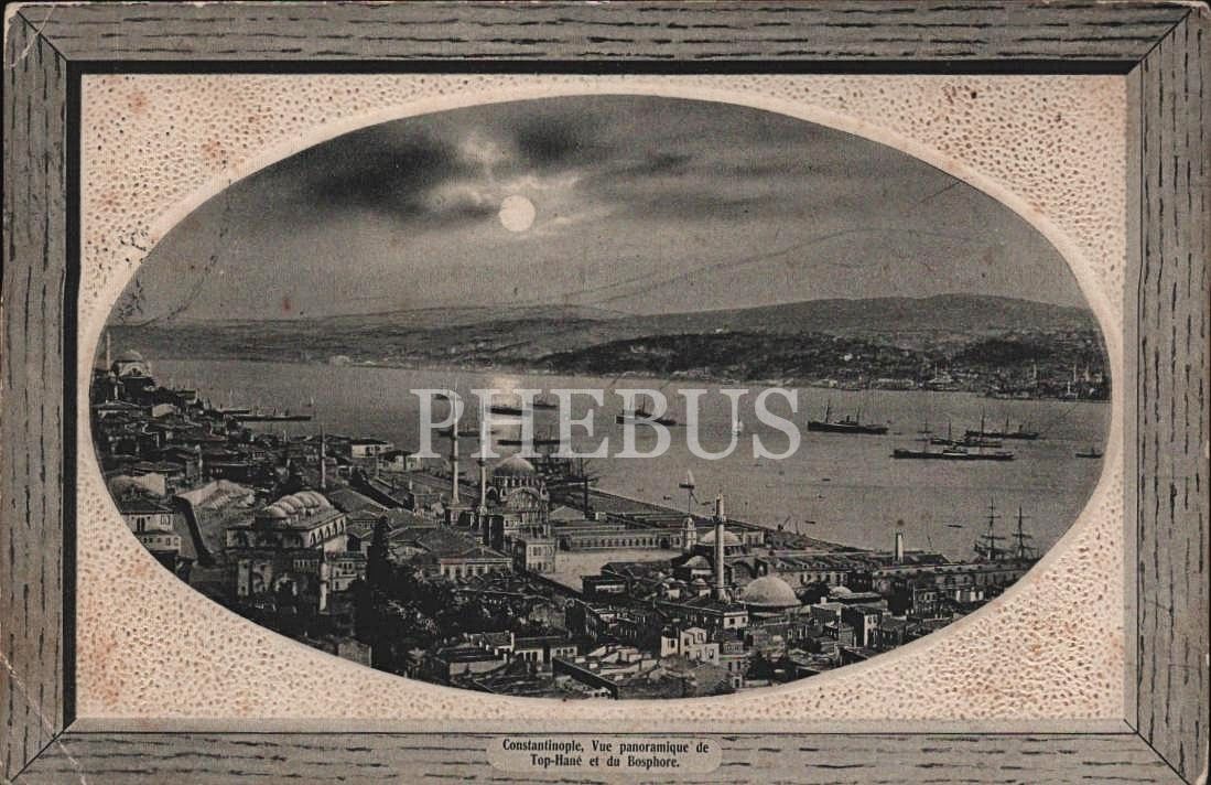 Tophane üzerinde boğaz manzarası, "Constantinople, Vue panoramique de Top-hane et du Bosphore", ed.: J. M. F., Galata, postadan geçmiş, İstanbul, 14x9 cm...