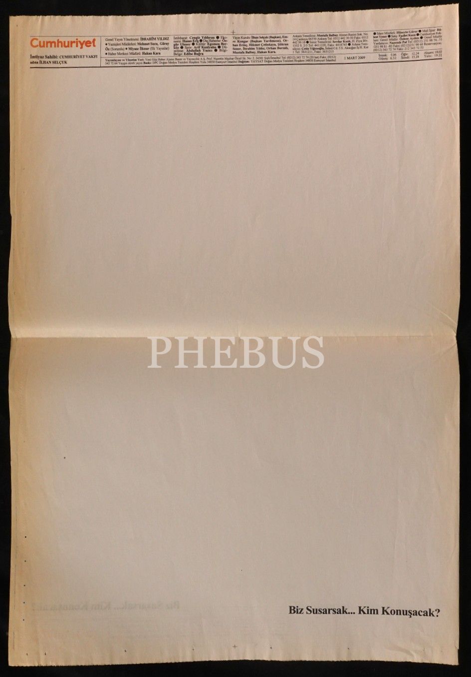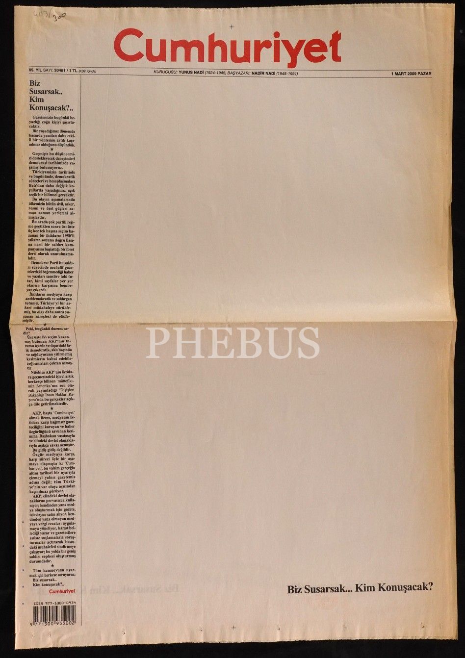 1 Mart 2009 tarihli Cumhuriyet gazetesinin, hükümetin muhalif medya kuruluşlarına yönelik baskısından dolayı yayınladığı, "Biz Susarsak... Kim Konuşacak?" manşetli beyaz sayfa protesto sayısı, 4 sayfa...