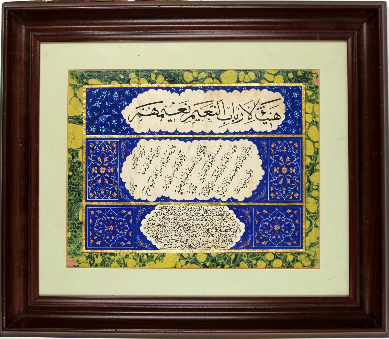 Sülüs Nesih icazetname, El Hac Mehmed Rüşdi, 1286 tarihli, tezhipli, çerçeveli, 30x25 cm.