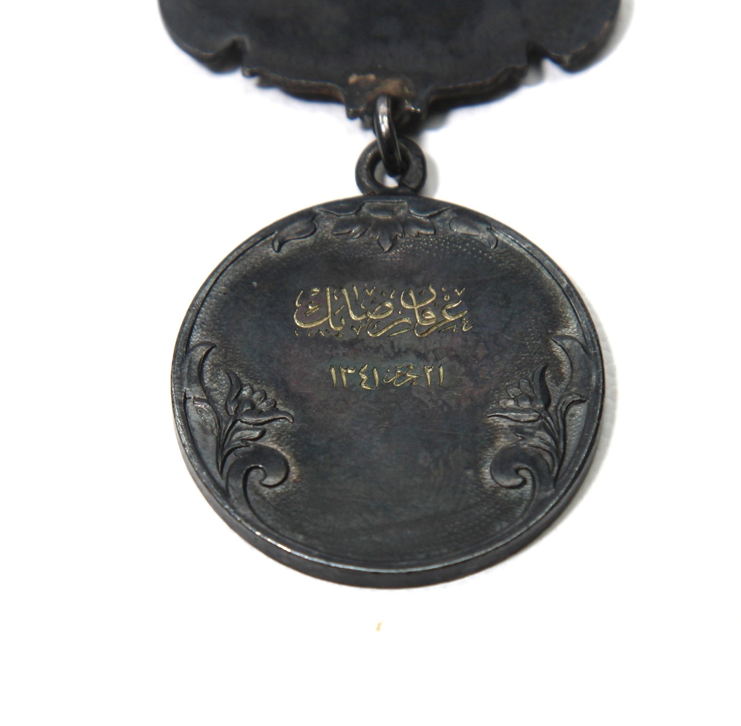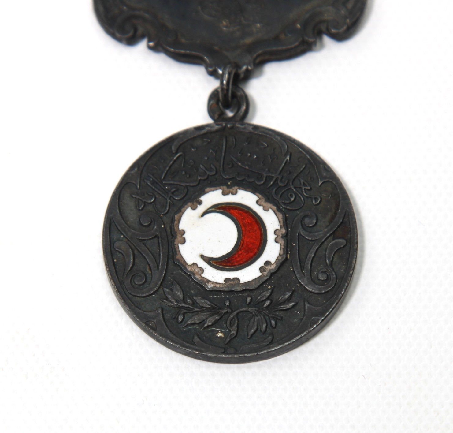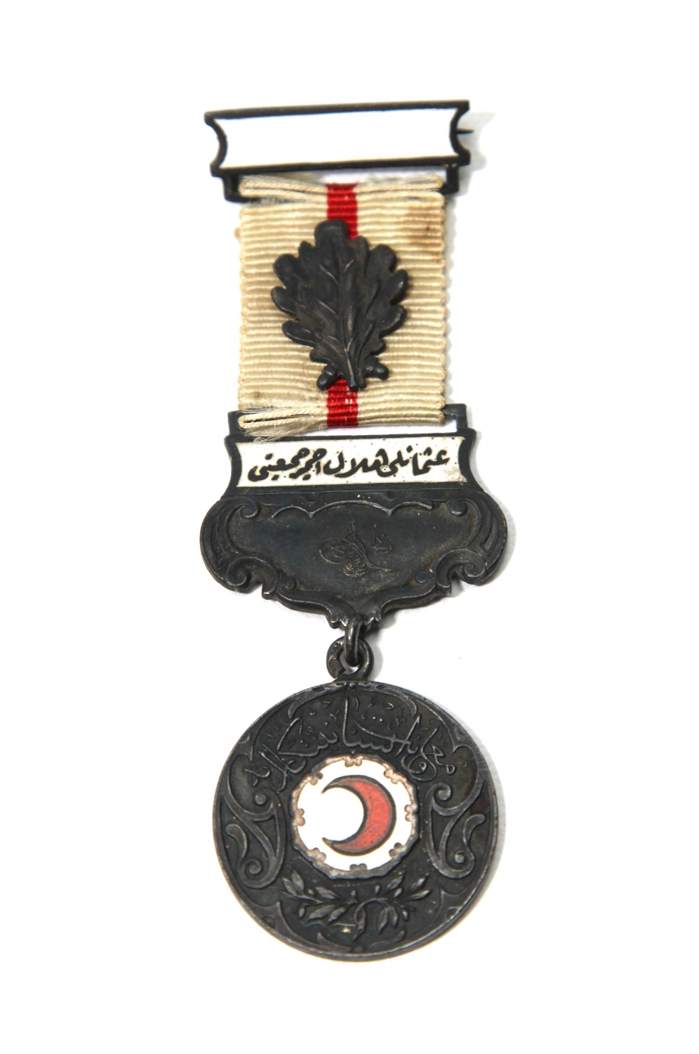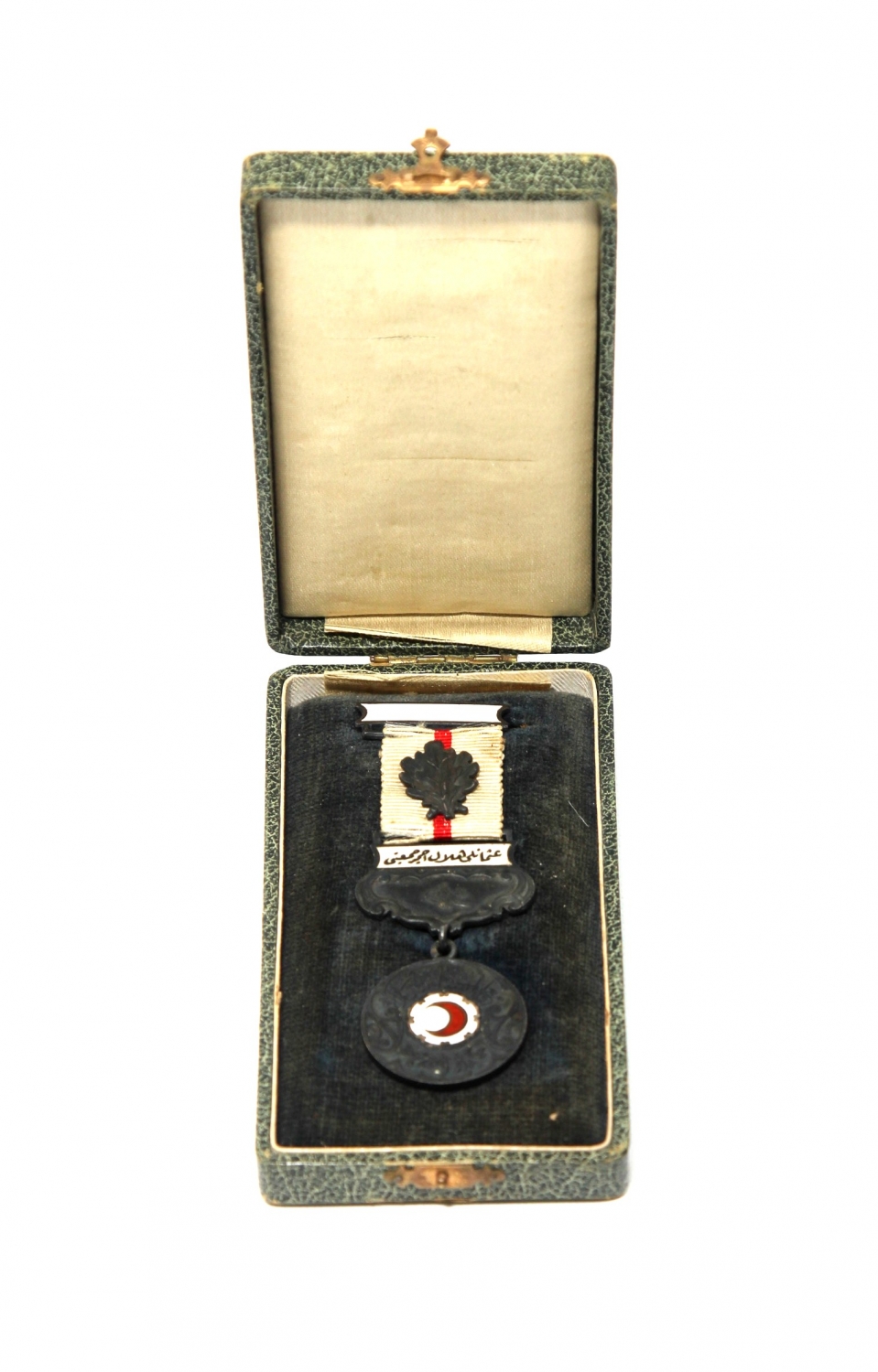 Osmanlı Hilal-i Ahmer Cemiyeti Madalyası, İrfan Rıza Bey'e ait, kurdele üzerine savaşa katıldığına işaret eden taç iliştirilmiş, hicri 1341 tarihli, Sultan Reşad tuğralı, yeşil dönem kutusunda, 3x9,5 cm.