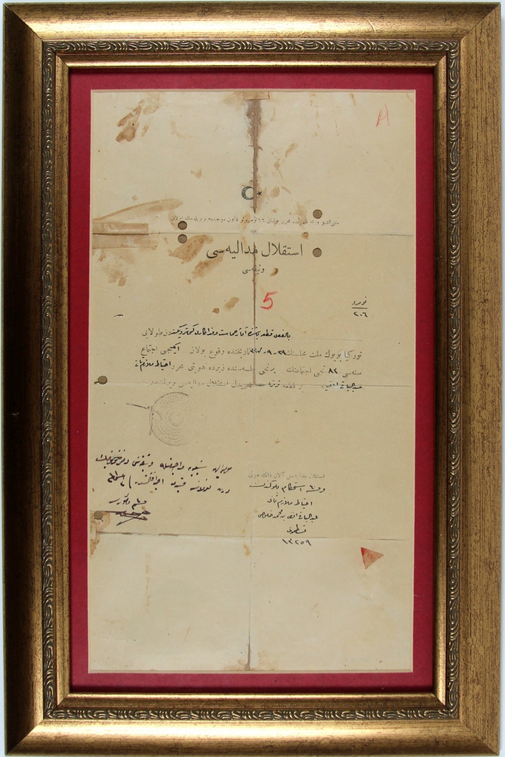 İstiklal Madalyası Vesikası, İhtiyat Mülazım-ı Sani Abdülbaki Efendi'ye verilmiş, 206 numaralı, 1337 tarihli, Mustafa Kemal Atatürk stampa imzalı, çerçeveli, 19x34 cm.