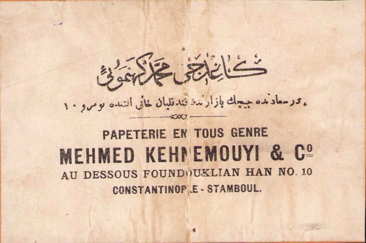 Osmanlıca etiket, Kağıtçı Mehmed Kehnemouyi, Dersaadet'de Çiçek Pazarı'nda, 10,5x7 cm.