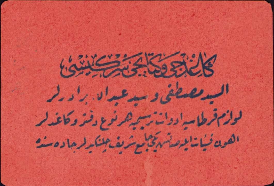 Osmanlı etiket, Kağıtçı ve Kitapçı Sergisi Es-Seyyid Mustafa ve Seyyid Abdullah Biraderler, 6x9 cm.