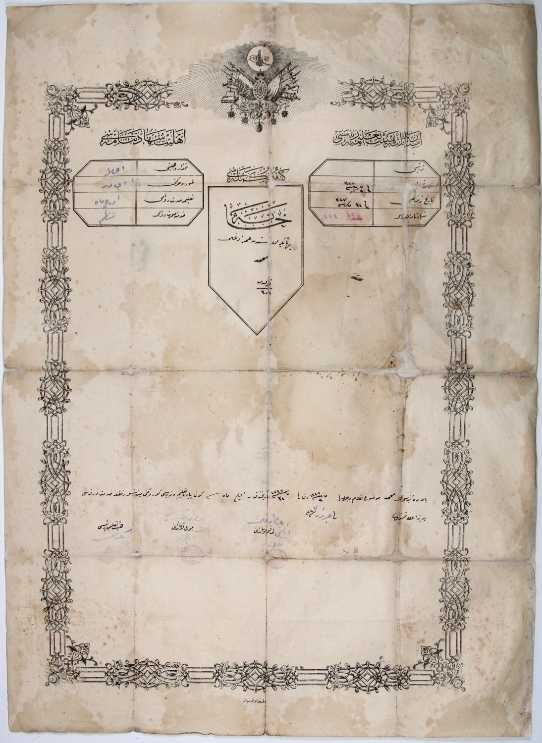 Ehliyet Şehadetnamesi, Ömer oğlu Mehmed'e ait, Matbaa-i Motosyan, 1327 tarihli, 41x55,5 cm.