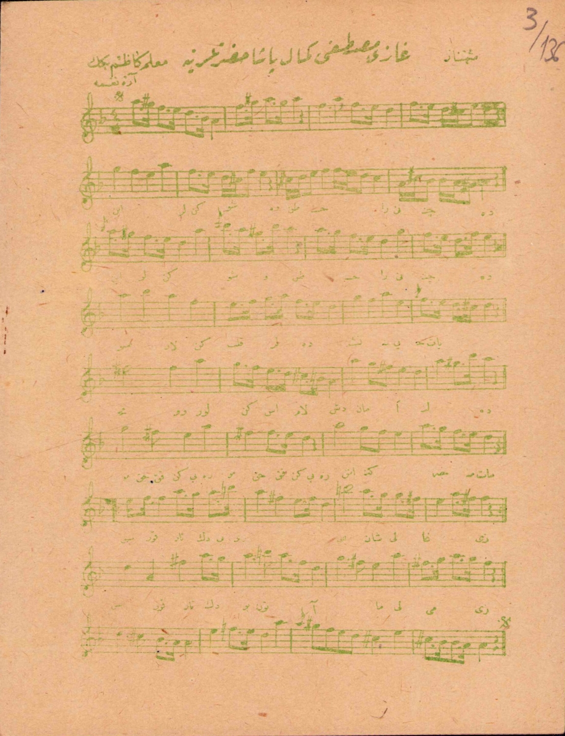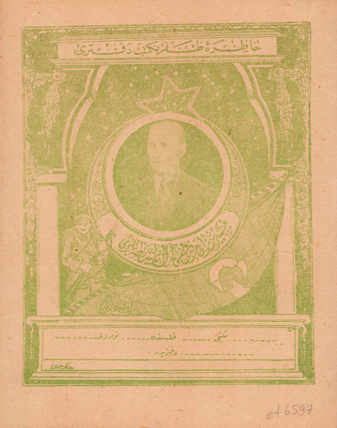 Osmanlıca defter kabı, arka kapağında 'Gazi Mustafa Kemal Paşa Hazretlerine' başlıklı nota, 15,5x20 cm.