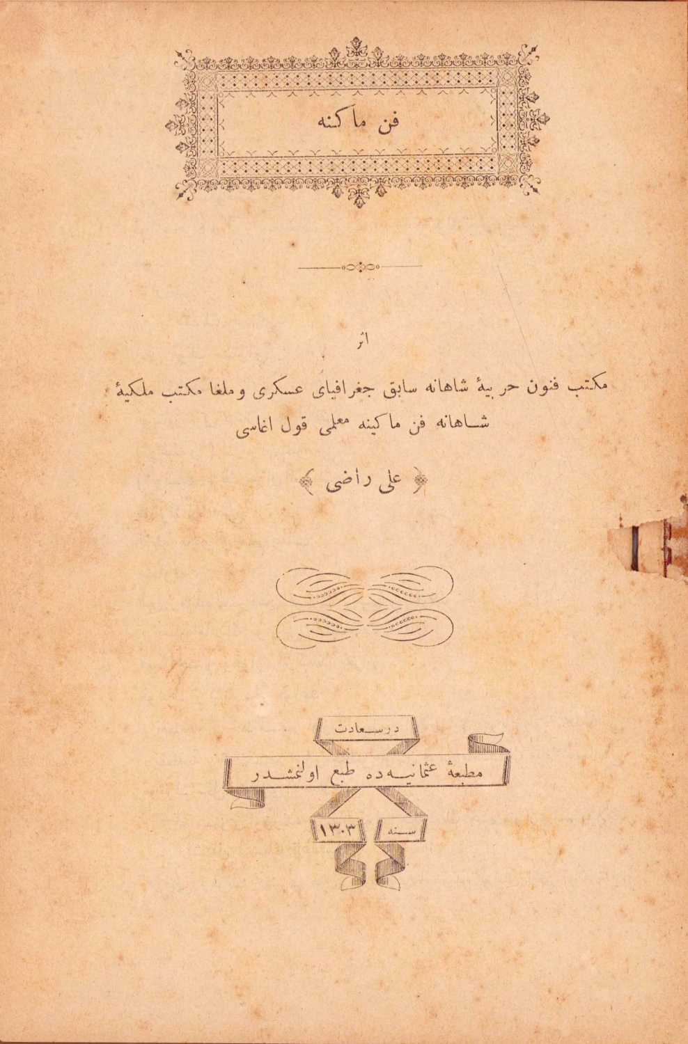Fenn-i Makina, Muharriri: Ali Razi, Osmanlıca 'Mükafat-ı Mekteb-i Ravza-yı Terakki' yazılı tuğralı cildinde haliyle, Dersaadet, 1303, Matbaa-i Osmaniye, 306 sayfa, 15,5x22 cm.