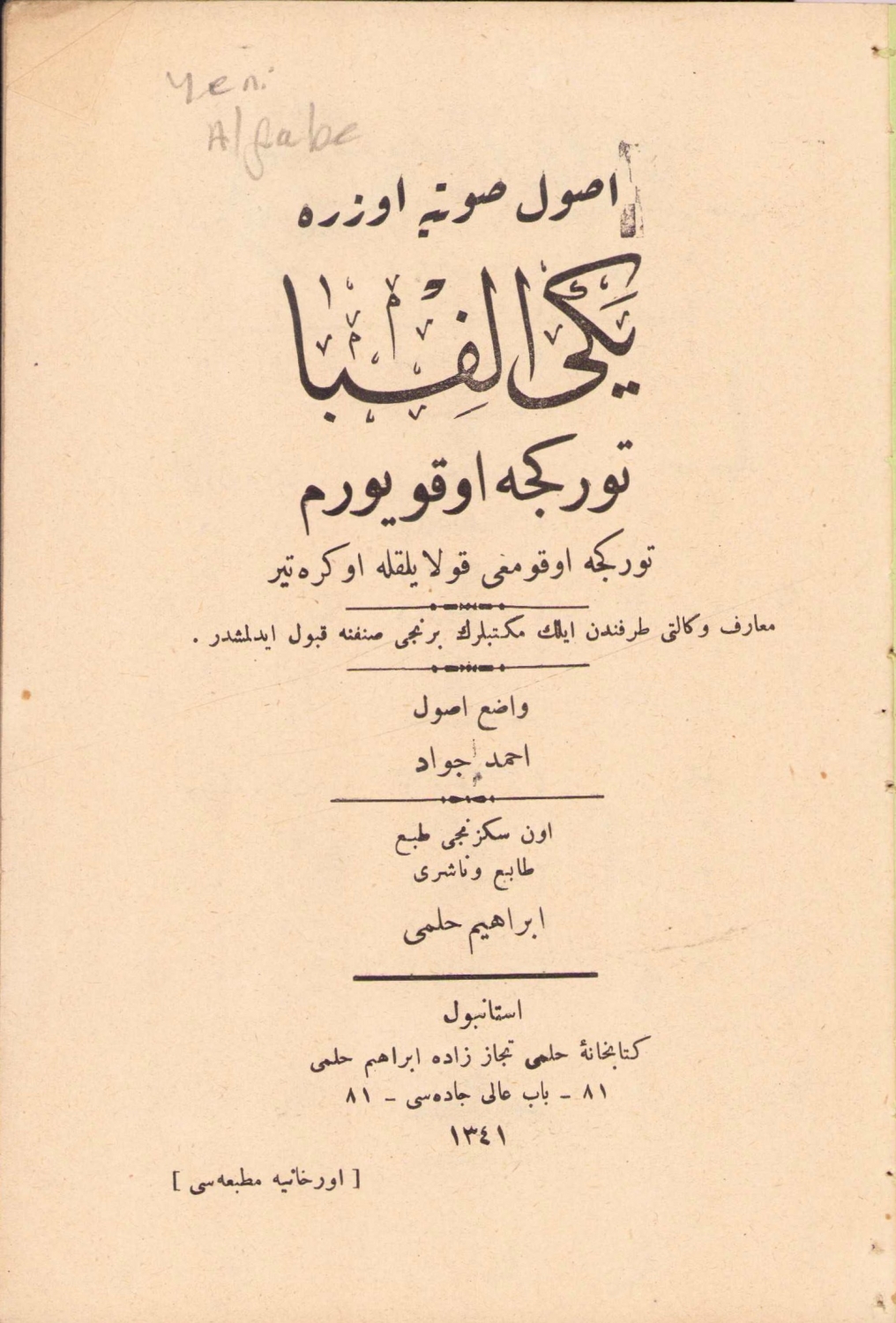 Yeni Alfabe Türkçe Okuyorum, Osmanlıca, Ahmed Cevdet, Naşiri: İbrahim Hilmi, İstanbul, 1341, Orhaniye Matbaası, 64 sayfa, 13,5x19,5 cm.