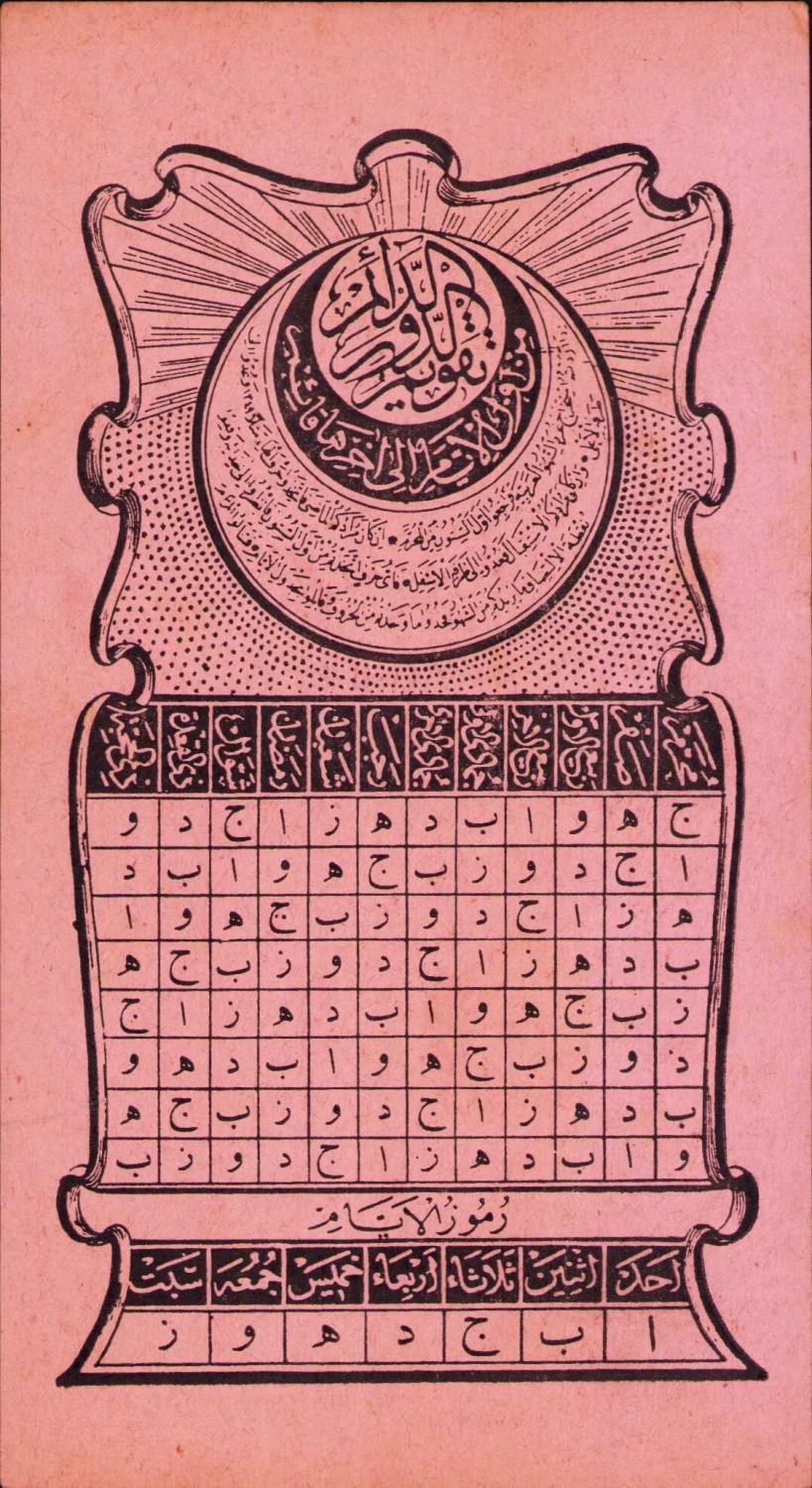 Arapça 'Min Evvelü'l Eyyam ala Ahirü'l Hakaniye' ve 'Rumuzü'l Eyyam' başlıkları taşıyan takvim, 9,5x17,5 cm.