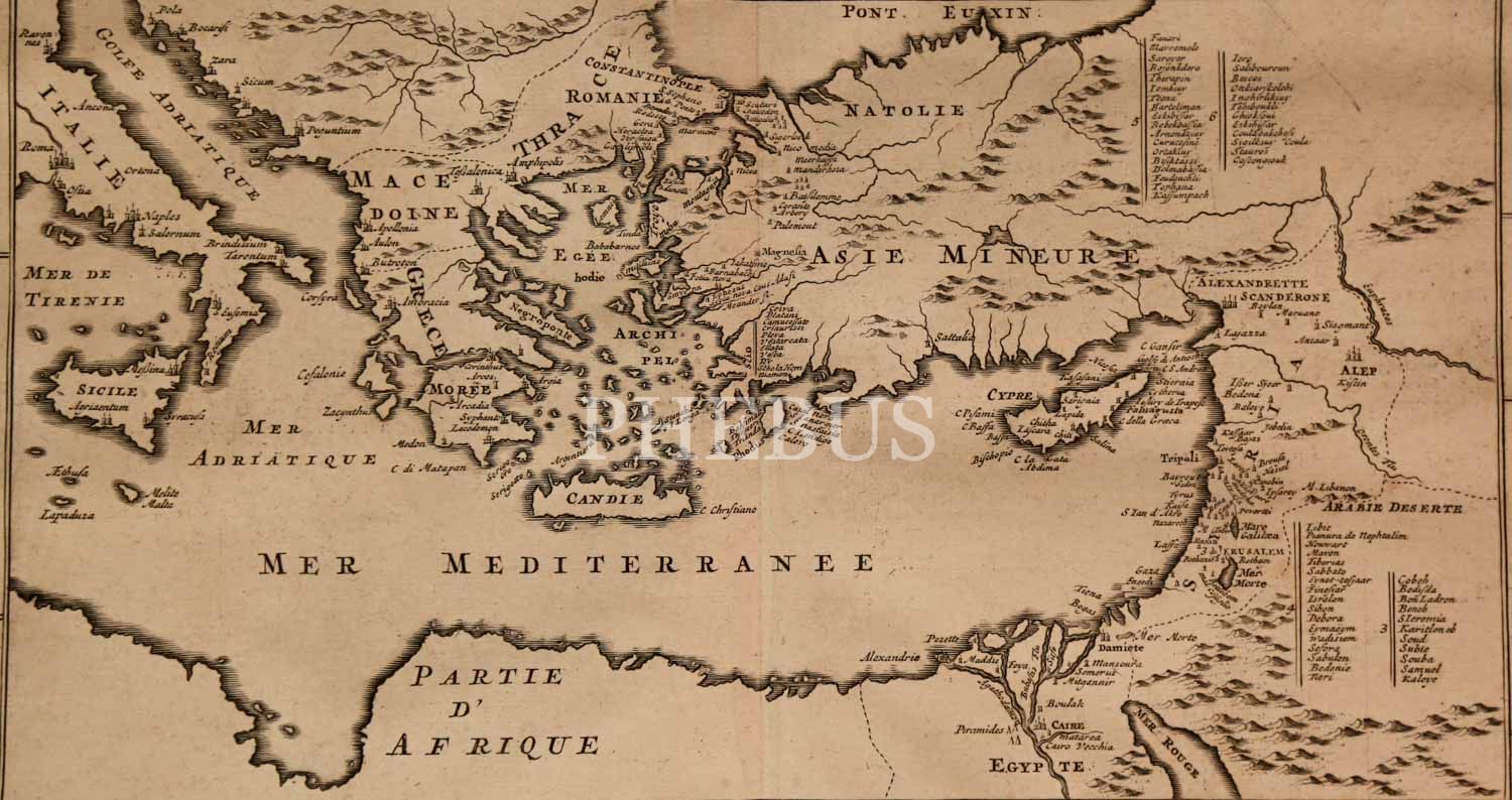 Bu etkileyici harita, Fransız haritacı Henri Abraham Catelain (1684-1743) tarafından hazırlanan ve tarihi haritaların yanı sıra; eski hanedanlık armalarına, kostümlerine, dünyanın kozmografyası, coğrafyası, tarihi, kronolojisi, şeceresi, topografyası gibi önemli bilgilere de yer veren "Atlas Historique, Ou Nouvelle Introduction A L'Histoire..." adlı, döneminin en kapsamlı atlasından alınmıştır.