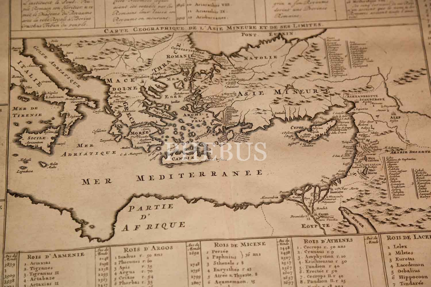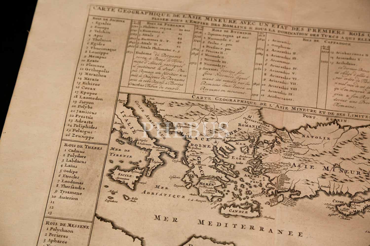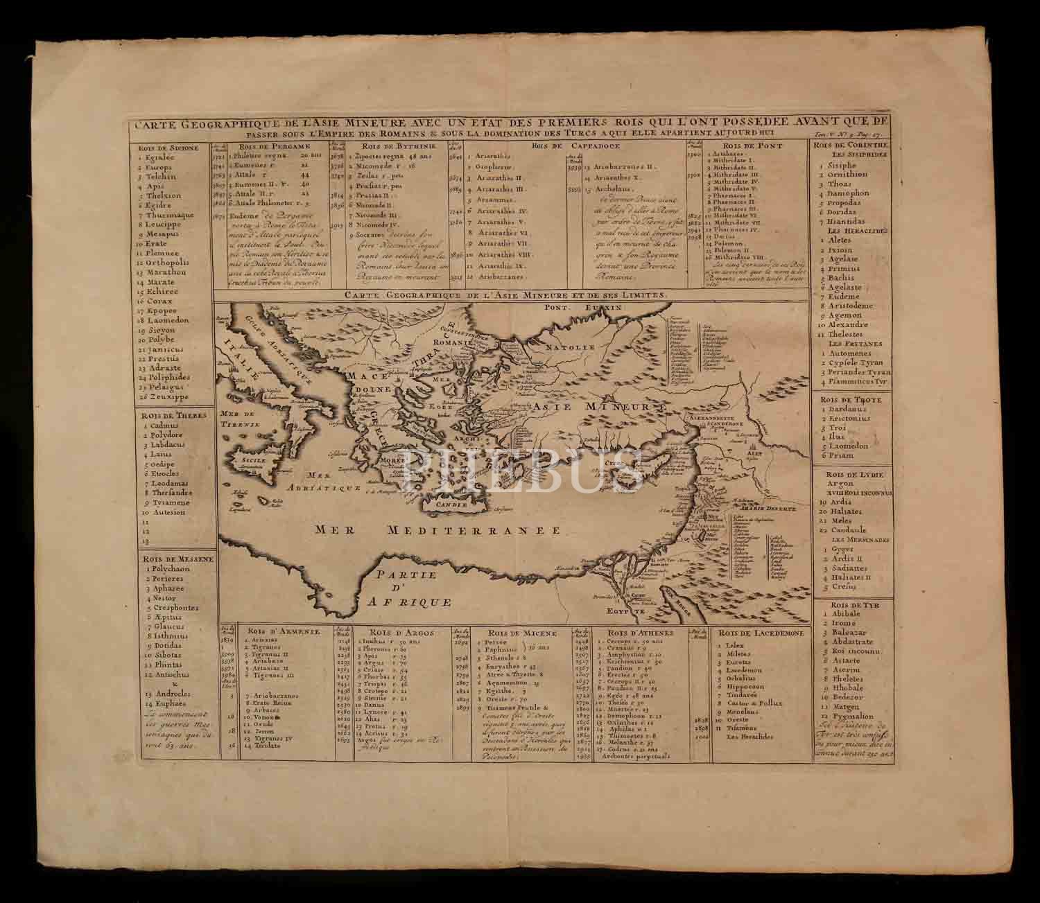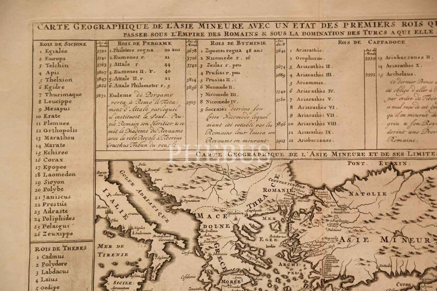 CARTE GEOGRAPHIQUE DE L'ASIE MINEURE AVEC UN ETAT DES PREMIERS ROIS QUI L'ONT POSSEDEE AVANT QUE DE PASSER SOUS L'EMPIRE DES ROMAINS & SOUS LA DOMINATION DES TURCS A QUI ELLE APARTIENT AUJORD'HUI, Henri Chatelain, 1720, bakır oyma baskı, 56x48 cm…