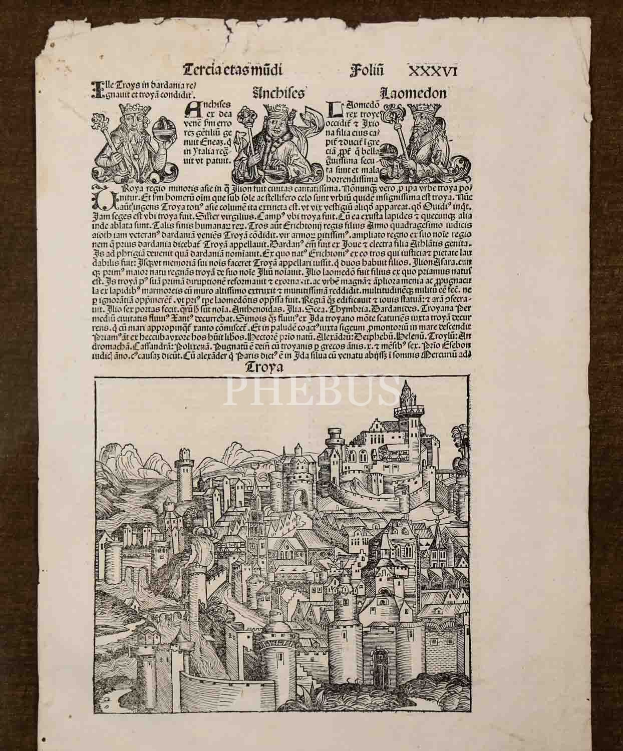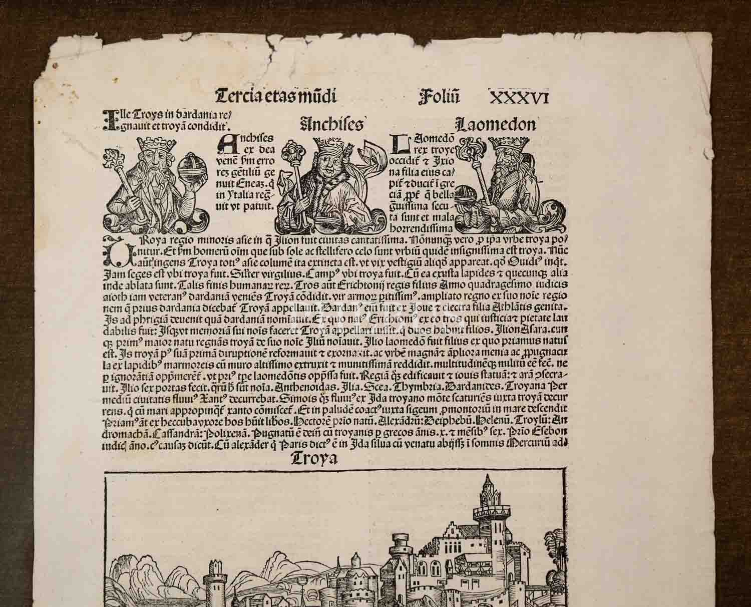 Kitâb-ı Mukaddes temel alınarak insanlık tarihinin anlatıldığı "Nürnberg Kroniği" kitabından alınmış, "Tercia etas mundi (Dünyanın Üçüncü Çağı)" üst başlıklı Truva gravürü...