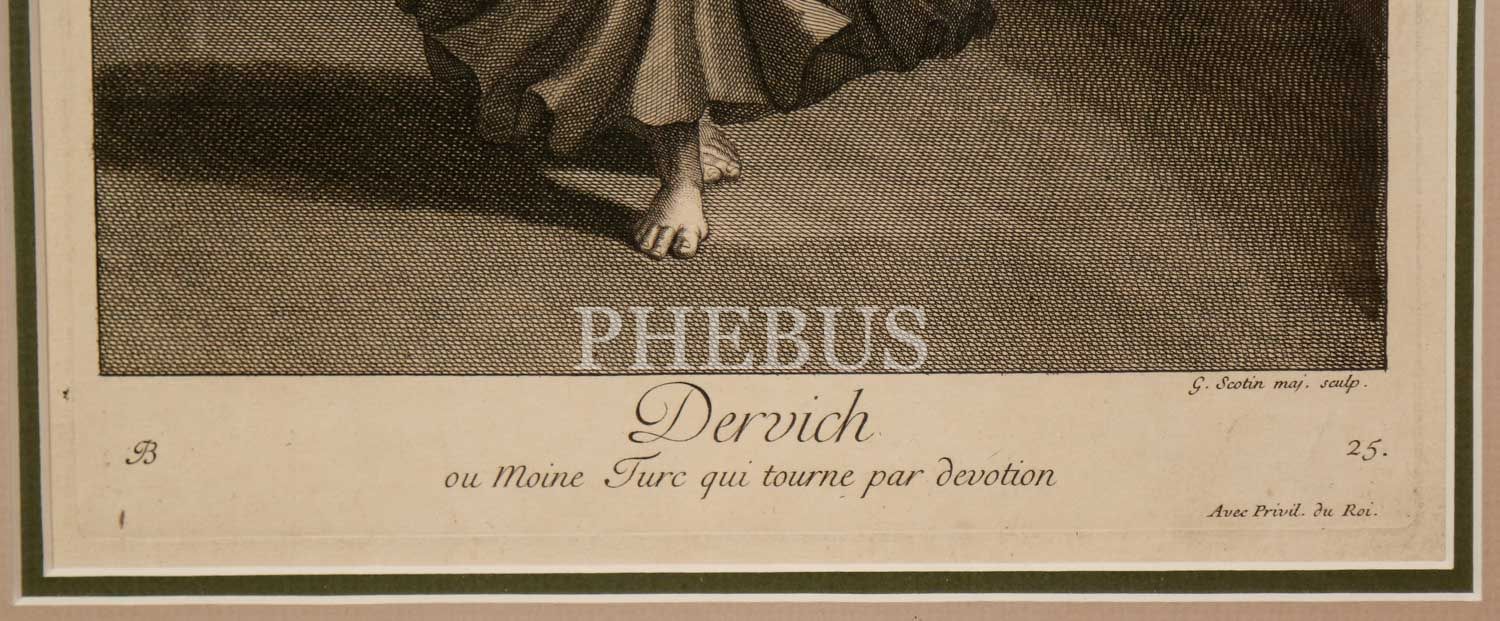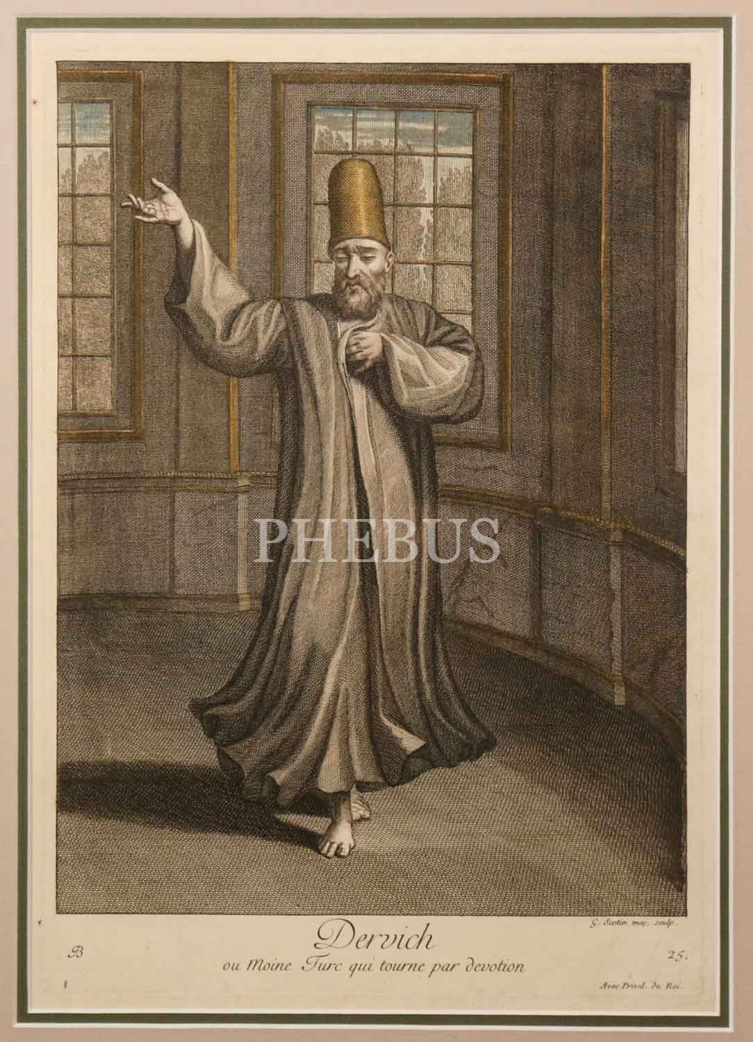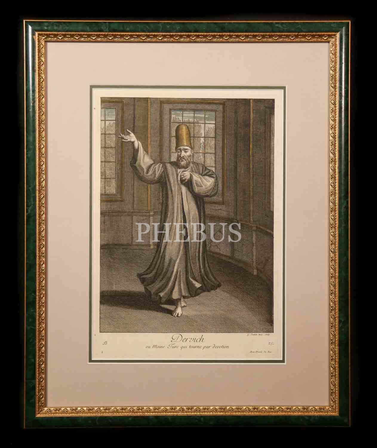 DERVICH OU MOINE TURC QUI TOURNE PAR DEVOTION (Derviş veya huşu içinde dönen Türk keşiş), Jean-Baptiste Van Mour, 1714, bakır oyma baskı, (çerçevesiyle birlikte) 44x56 cm...