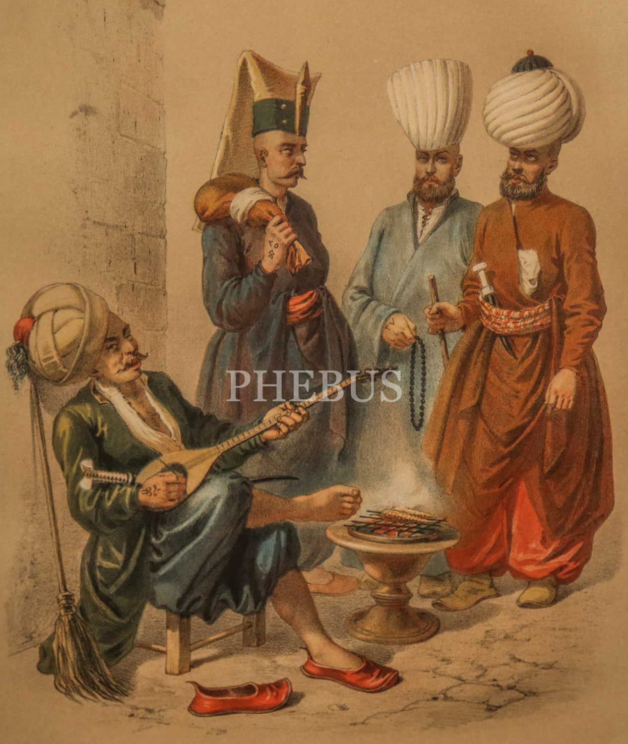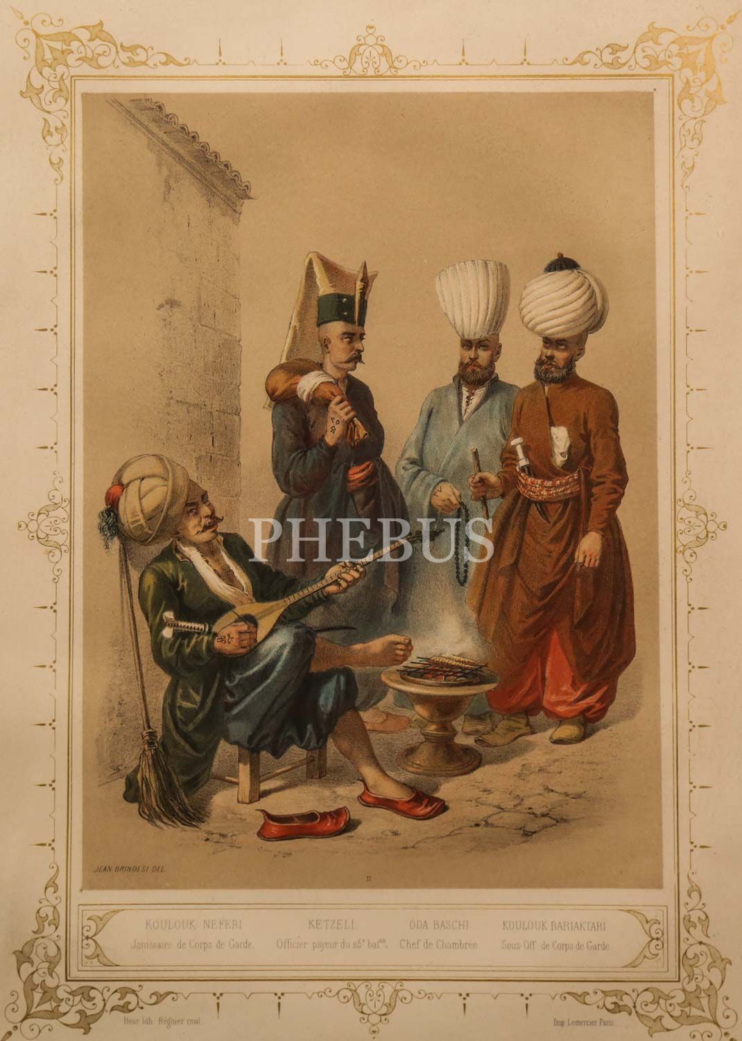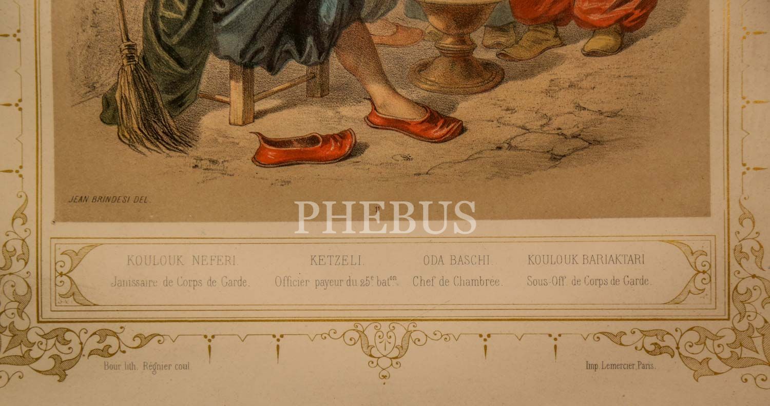 KOULOUK NEFERI, KETZELI, ODA BASCHI, KOULOUK BARIAKTARI (Kolluk Neferi, Keçeli, Oda Başı, Kolluk Bayraktarı), Brindesi, 1855, taş baskı, (çerçevesiyle birlikte) 42x55 cm...