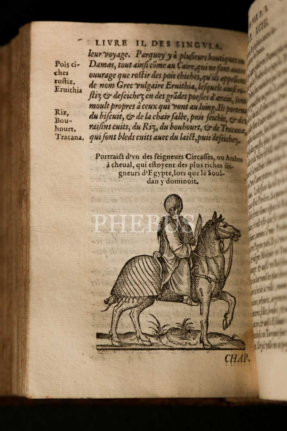 Fransız gezgin, doğa bilimci, yazar ve diplomat Pierre Belon´un (1517-1564), Yunanistan, Asya [Anadolu], Kudüs, Mısır, Arabistan ve çevre bölgelere dair gezi notlarından oluşan, ahşap baskı gravürlerle zenginleştirilmiş seyahatnamesi...