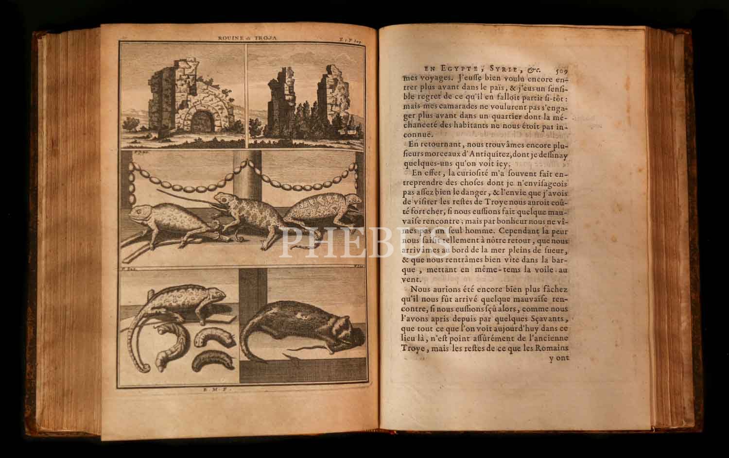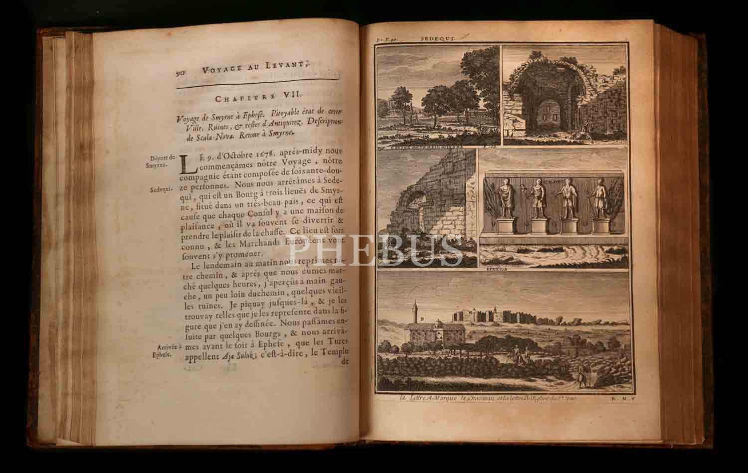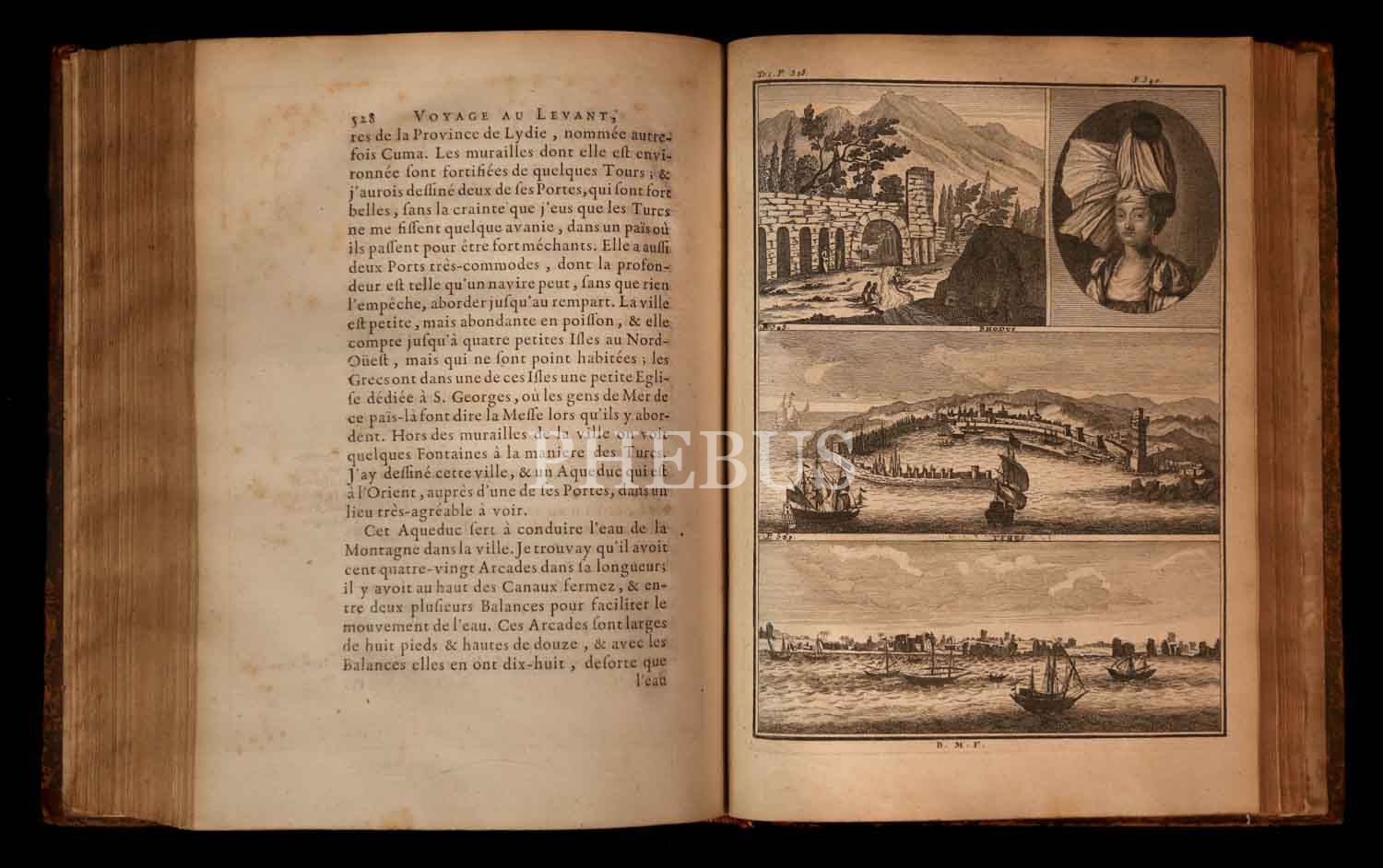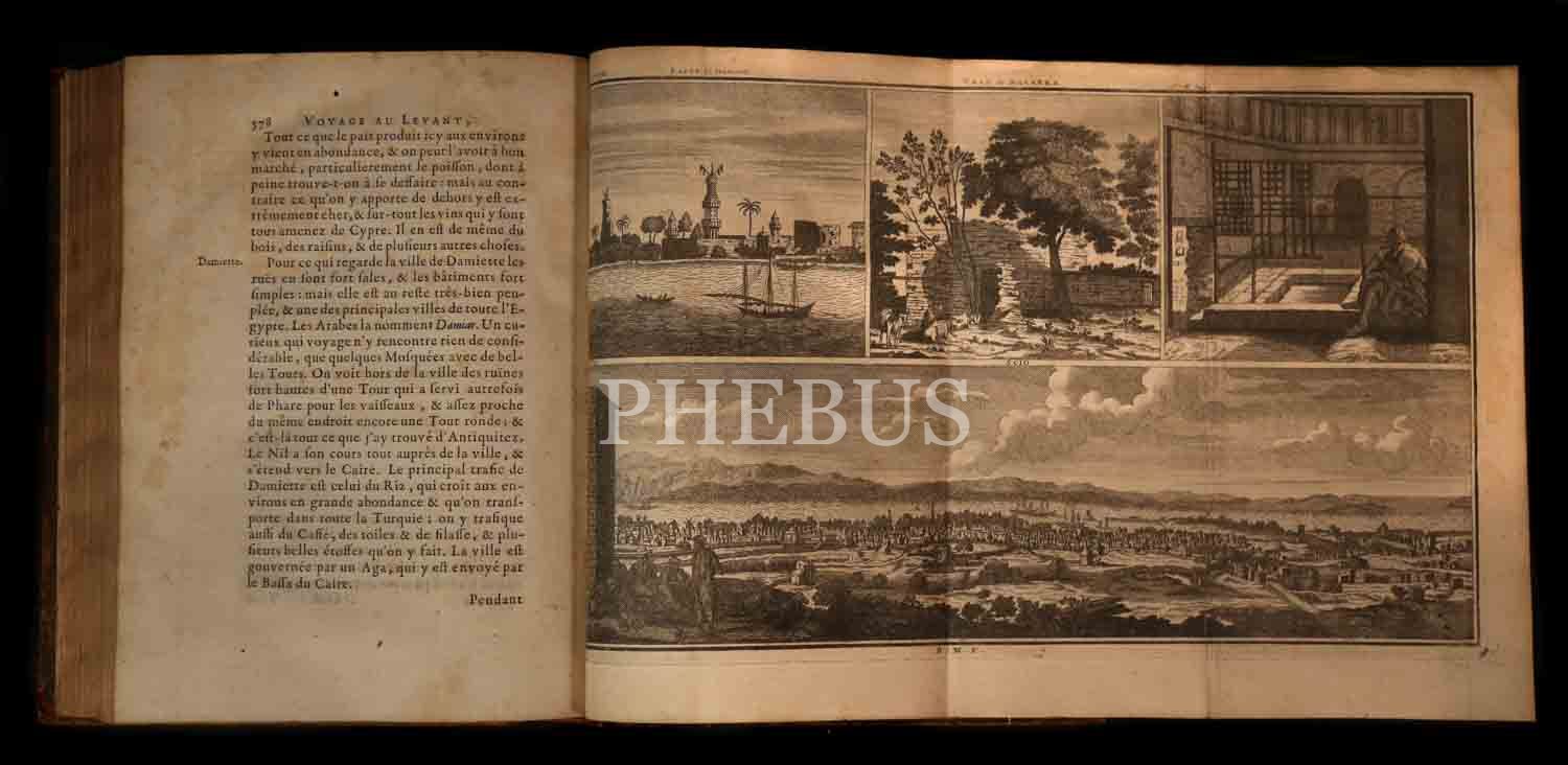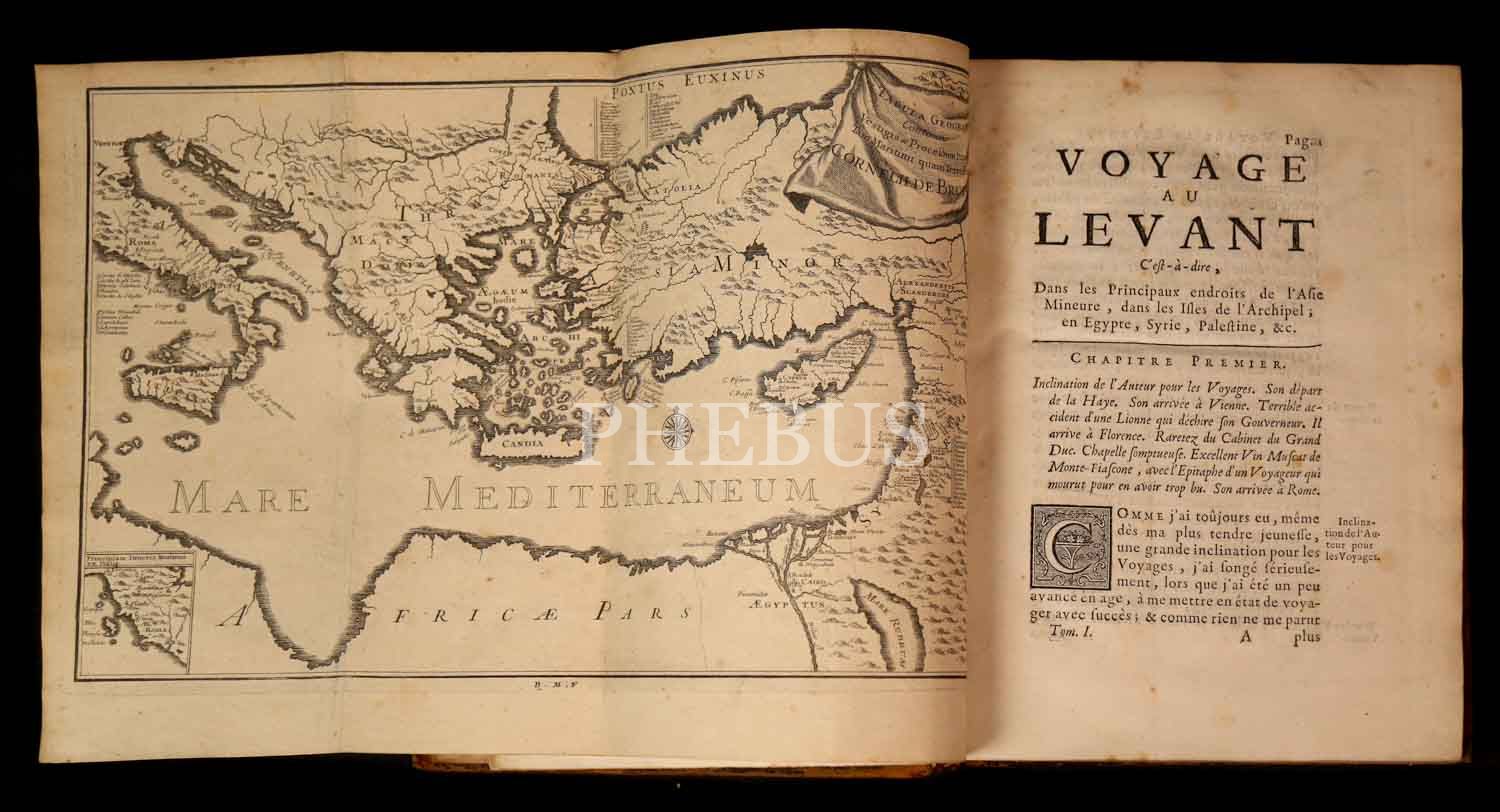 Hollandalı ressam ve seyyah Cornelis de Bruyn´un, 1678 yılında çıktığı ve 1684 yılında tamamladığı Osmanlı İmparatorluğu ve çevresini kapsayan 6 yıllık seyahatini son derece etkileyici gravürlerle süsleyerek anlattığı, 5 ciltlik ünlü seyahatnamesinin 1. cildi... 2 katlanır levha ve 12 gravürle zenginleştirilmiş Mısır ve Suriye ve Kutsal Topraklar gözlemleri... Sırtı restore edilmiş, orijinal deri cildinde...