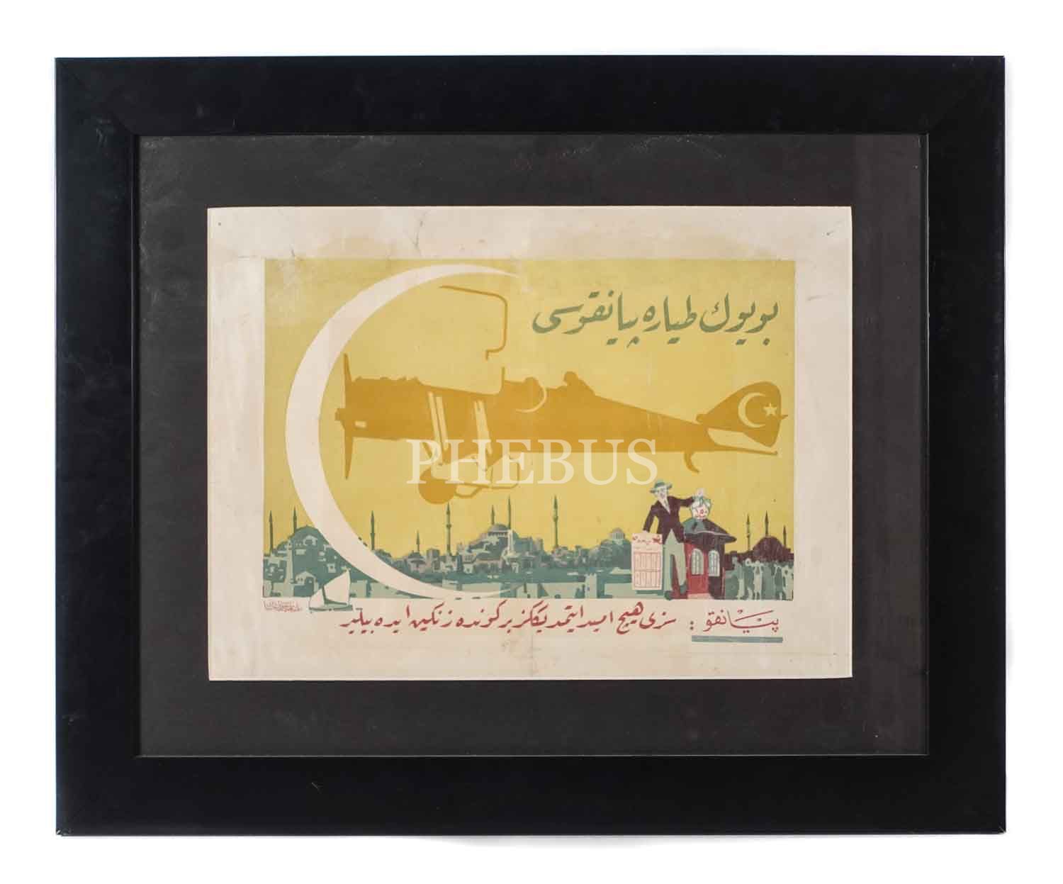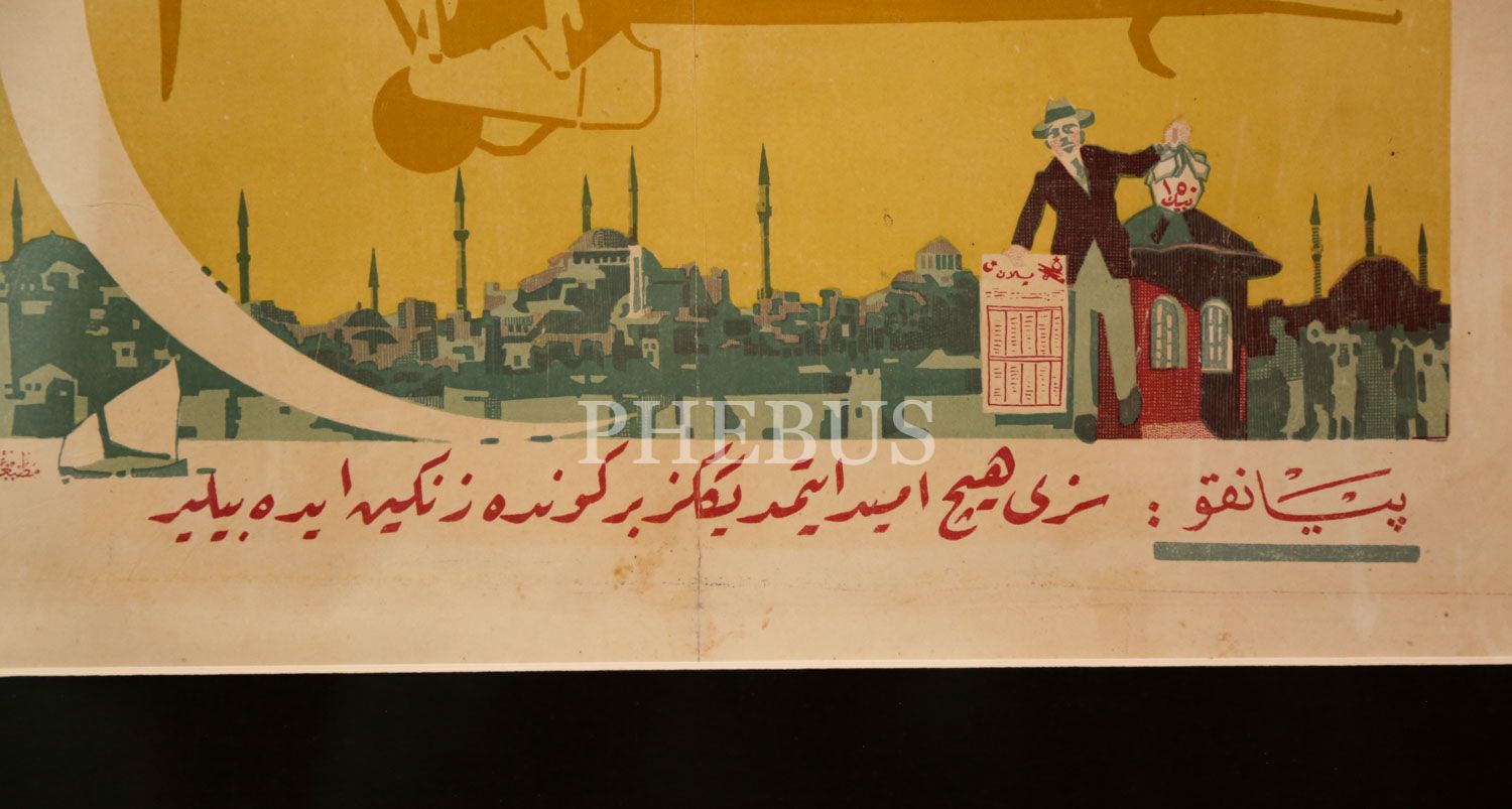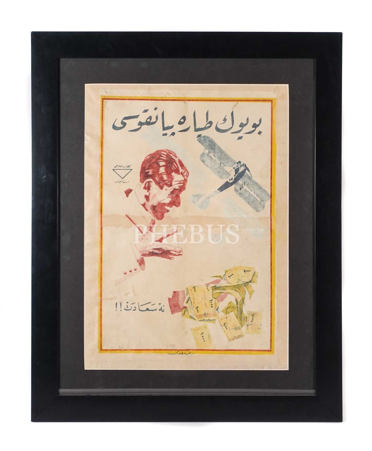 İhap Hulusi'den, Osmanlıca yazılı, çok nadir, iki adet "Büyük Tayyare Piyangosu" afişi: "Ne Saadet!" ve "Piyango: Sizi Hiç Ümit Etmediğiniz Bir Günde Zengin Edebilir!" sloganlı, Vatan Matbaası - Matbaa-i Ahmed İhsan, (çerçeveleriyle birlikte) 53x67 cm - 55x45 cm...