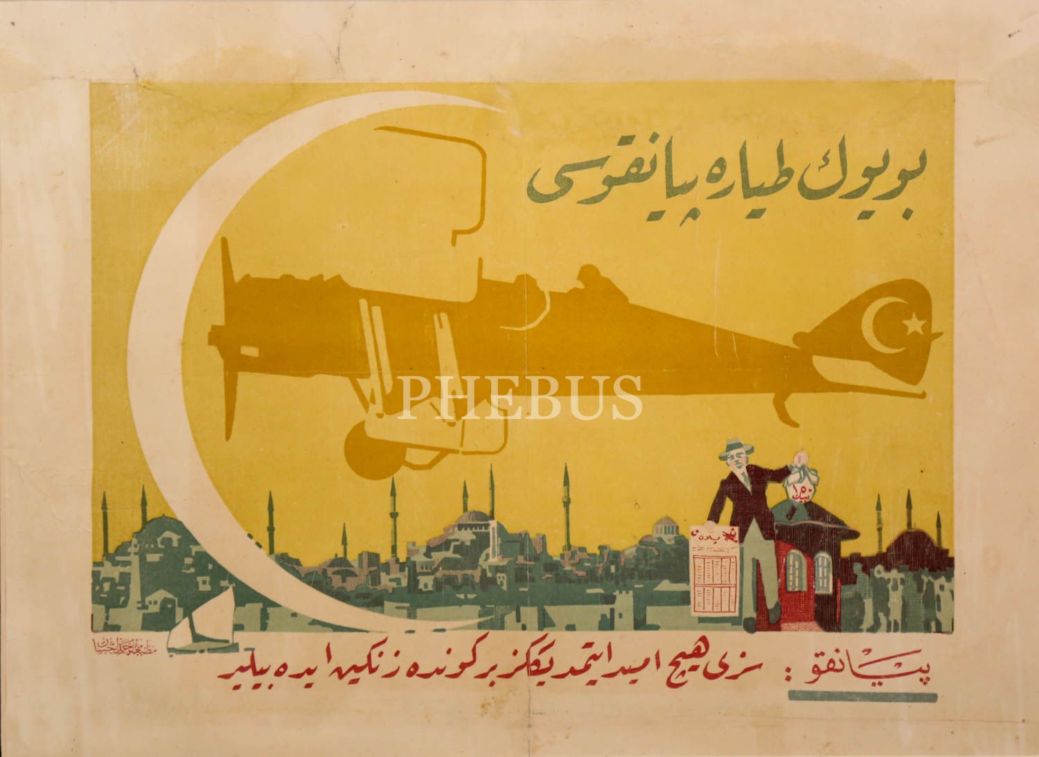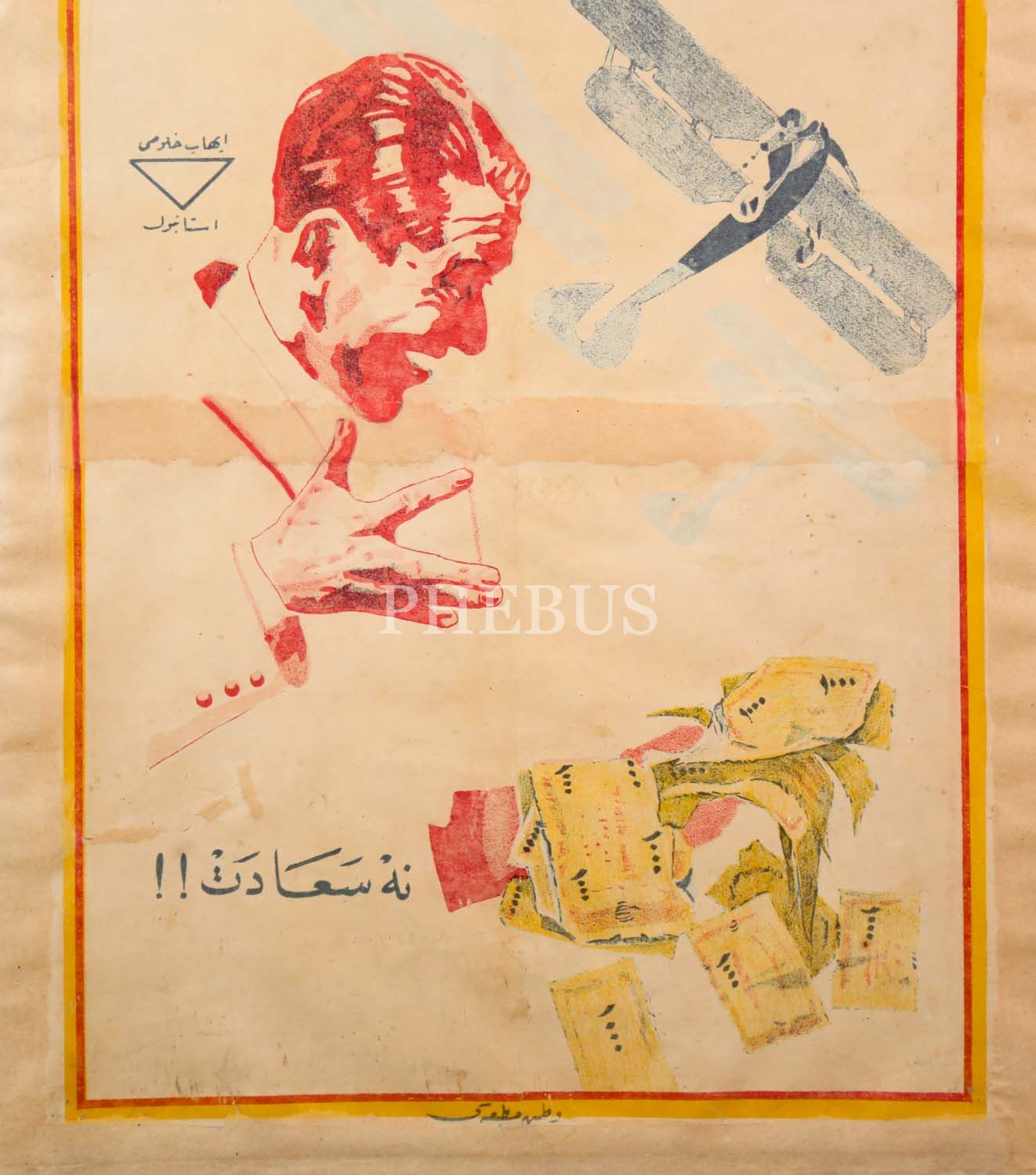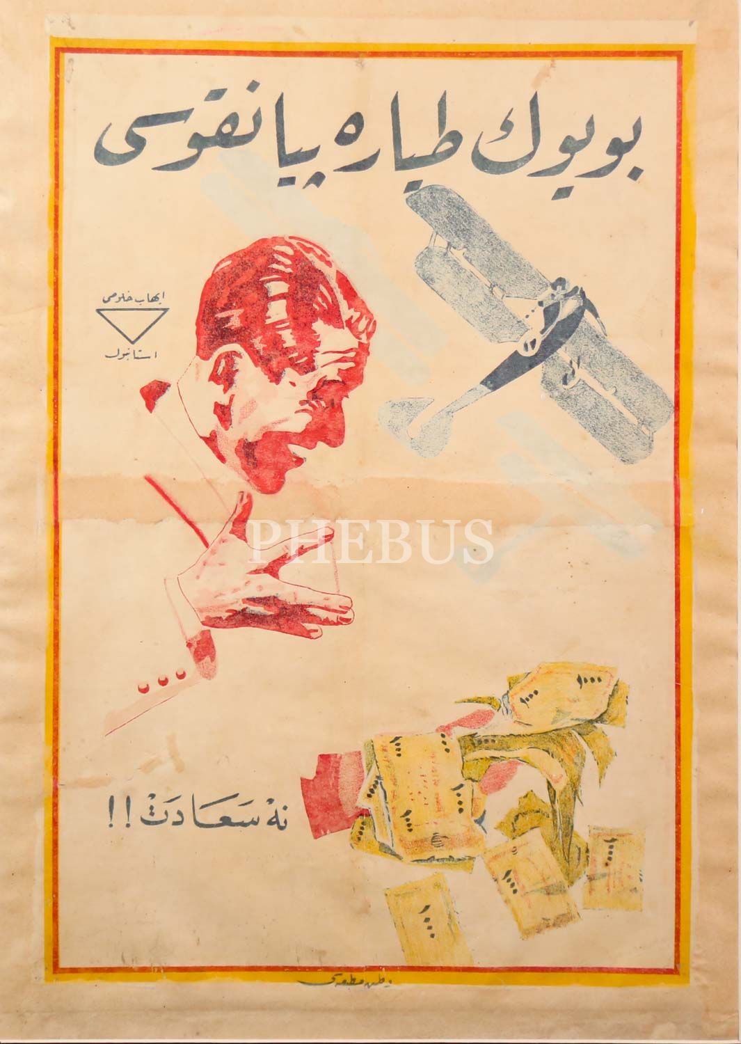 İhap Hulusi'den, Osmanlıca yazılı, çok nadir, iki adet "Büyük Tayyare Piyangosu" afişi: "Ne Saadet!" ve "Piyango: Sizi Hiç Ümit Etmediğiniz Bir Günde Zengin Edebilir!" sloganlı, Vatan Matbaası - Matbaa-i Ahmed İhsan, (çerçeveleriyle birlikte) 53x67 cm - 55x45 cm...