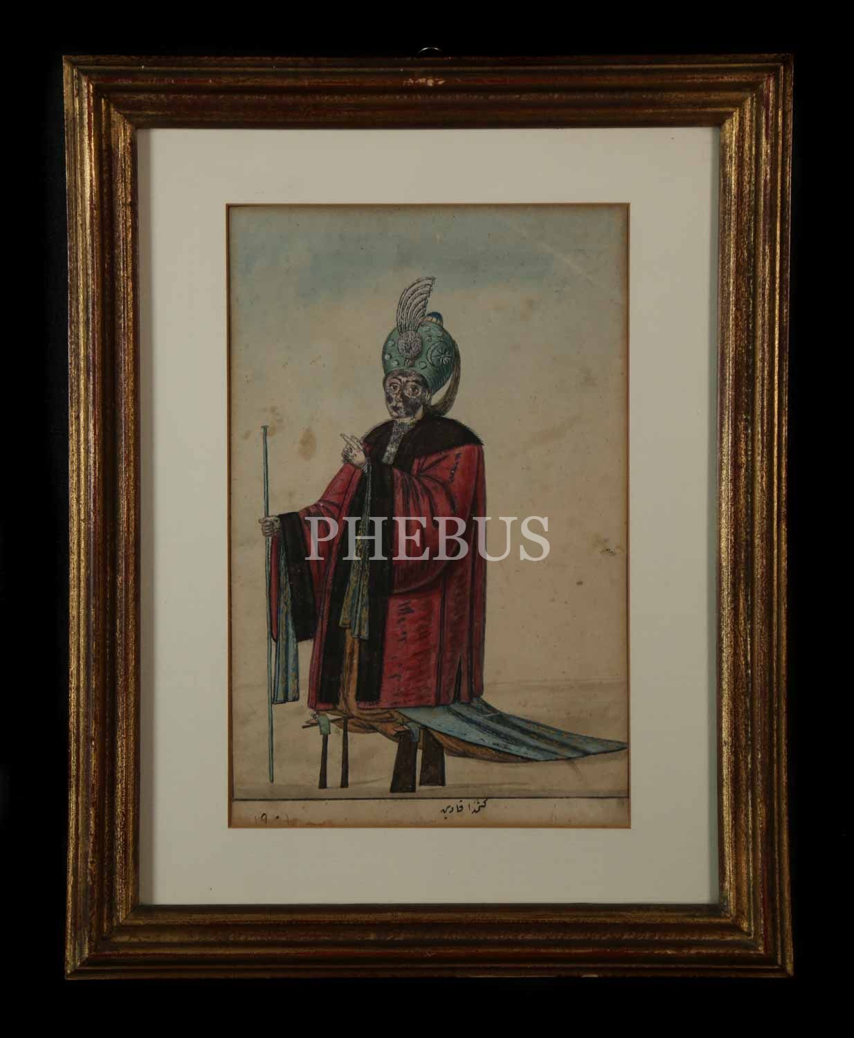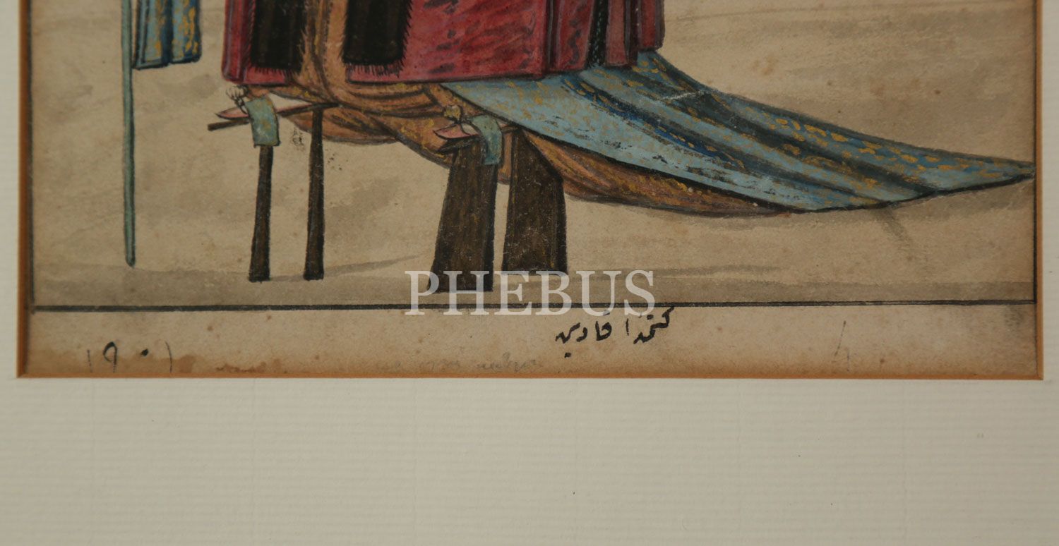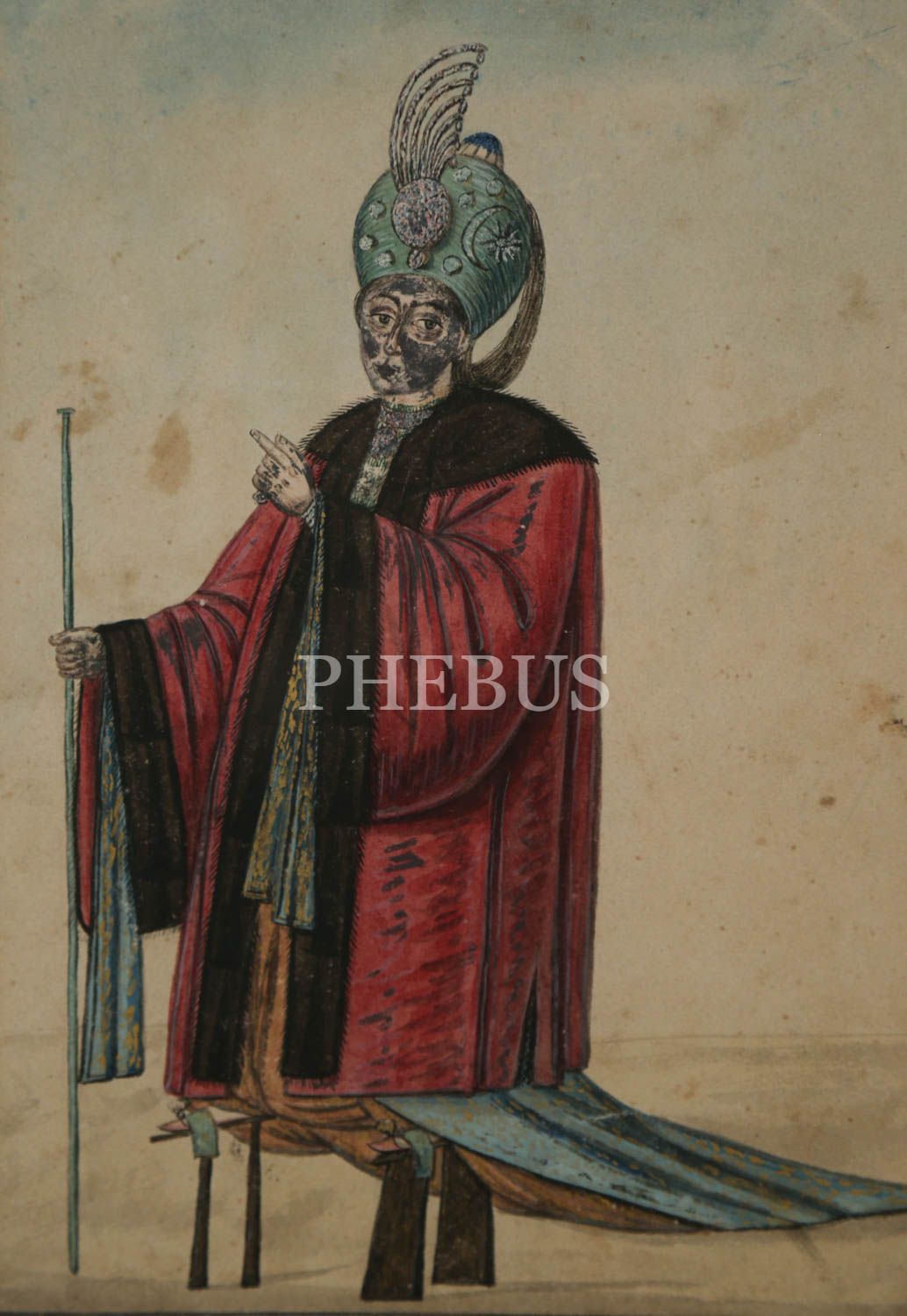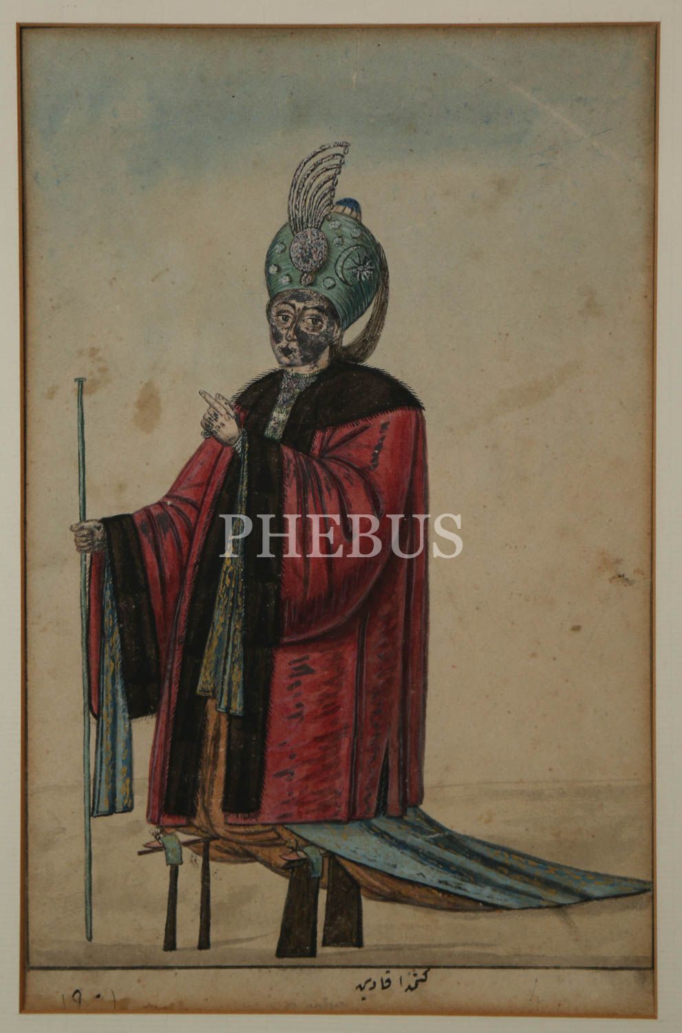 Sultan II. Mahmud devrinin askeri ve sivil devlet erkanını ayrıntılı bir şekilde resmetmesiyle tanınan Fenerci Mehmed´in Osmanlıca "Kethuda Kadın" başlıklı, elle renklendirilmiş orijinal çizim gravürü, 30x38 cm...