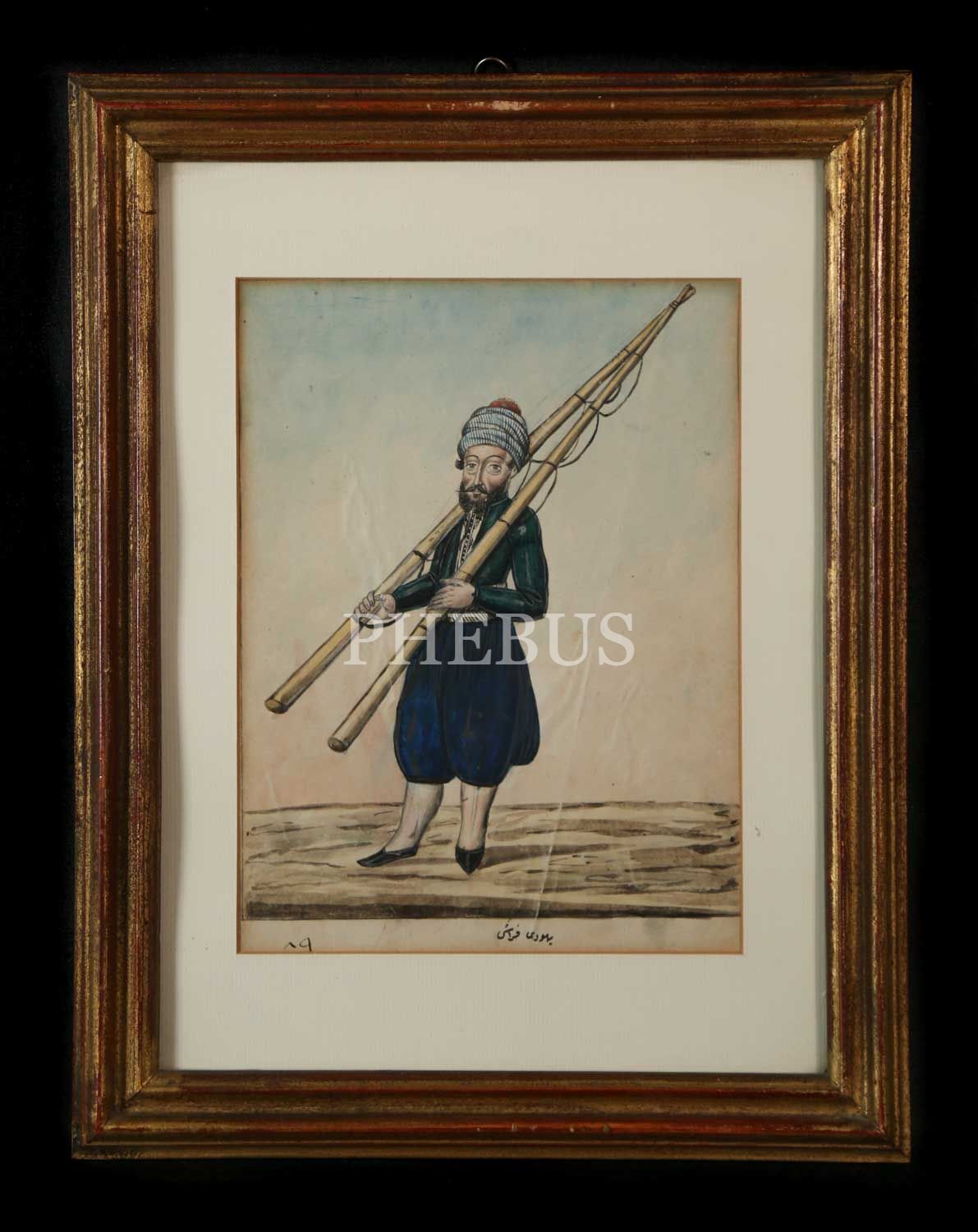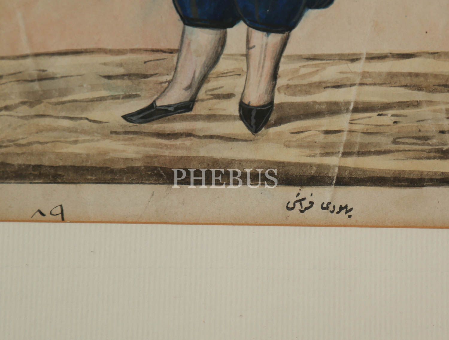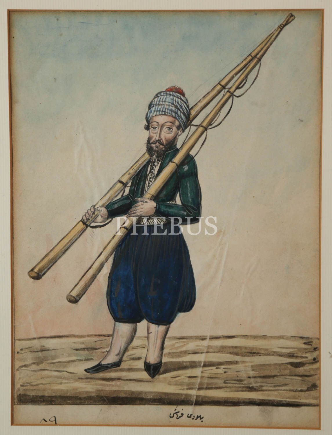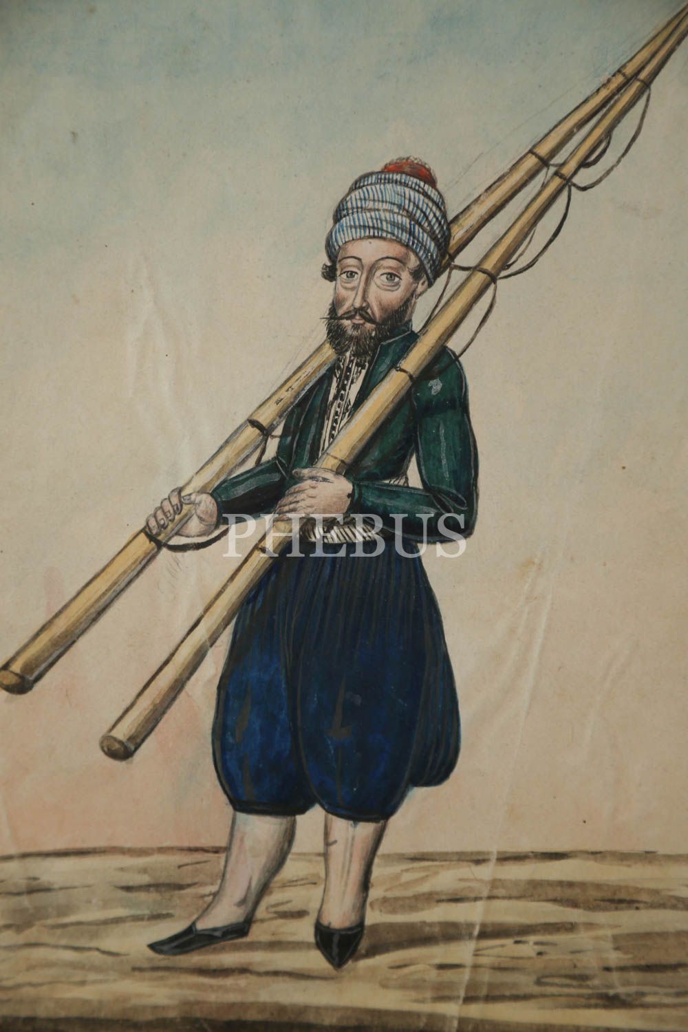Sultan II. Mahmud devrinin askeri ve sivil devlet erkanını ayrıntılı bir şekilde resmetmesiyle tanınan Fenerci Mehmed´in Osmanlıca "Yahudi Ferraşı" başlıklı, elle renklendirilmiş orijinal çizim gravürü, çerçevesiyle birlikte 30x38 cm...