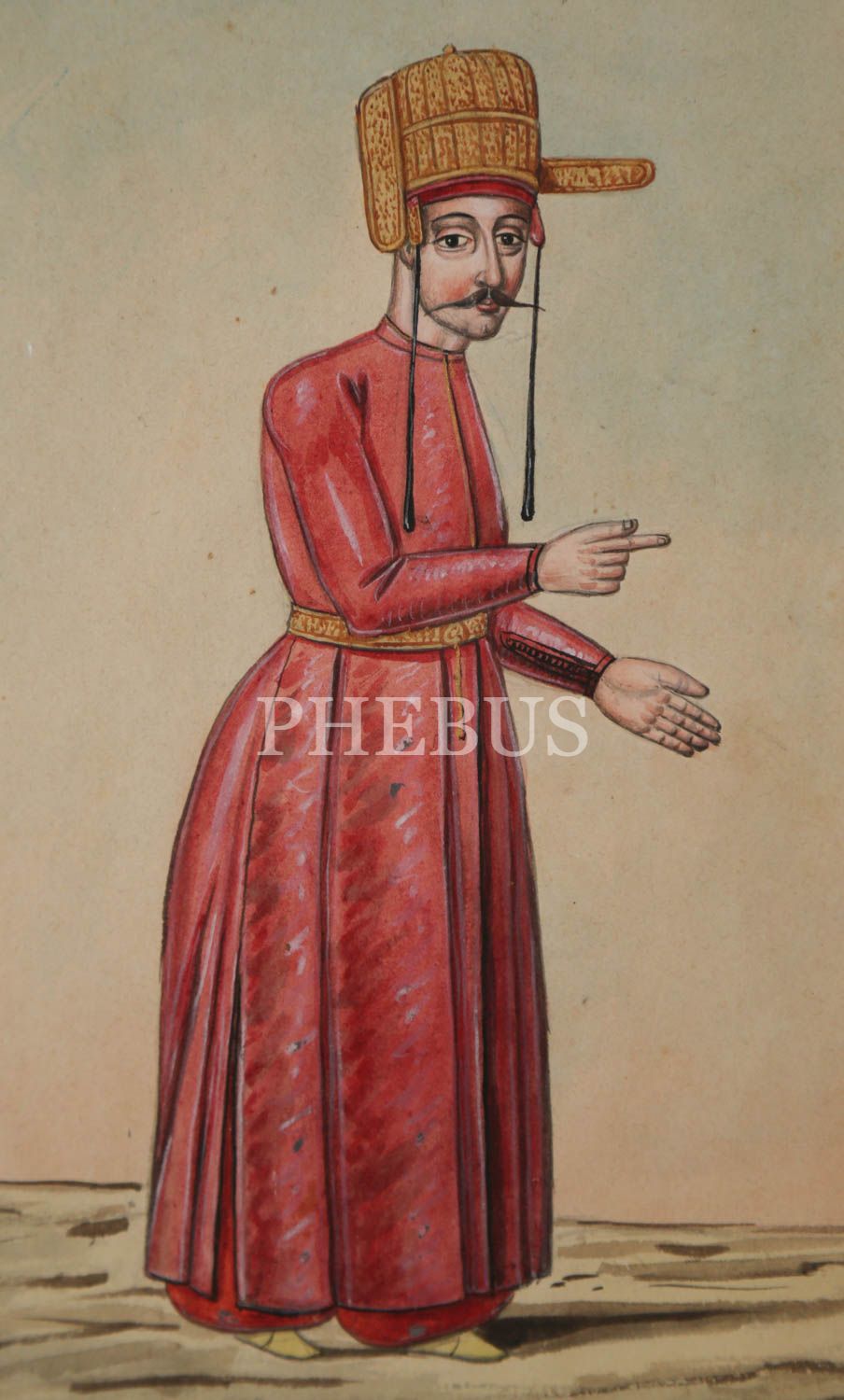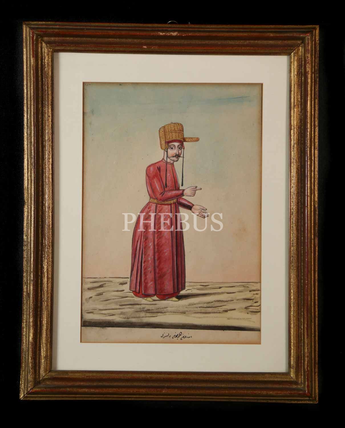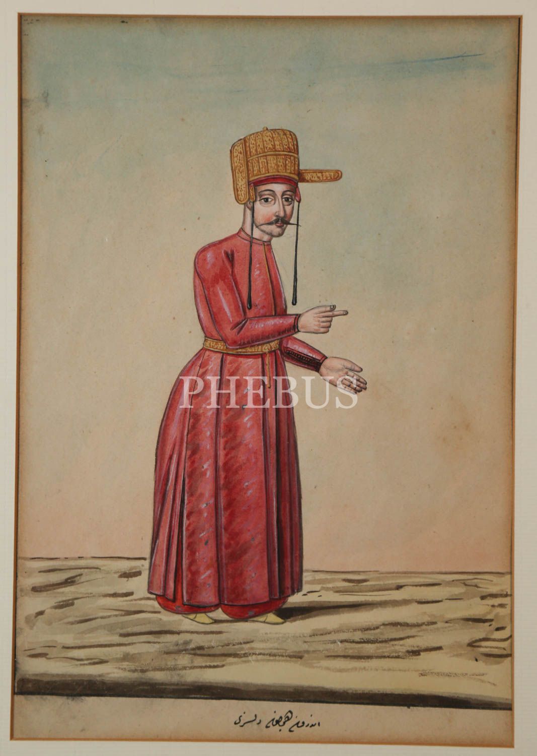 Sultan II. Mahmud devrinin askeri ve sivil devlet erkanını ayrıntılı bir şekilde resmetmesiyle tanınan Fenerci Mehmed´in Osmanlıca "Enderûn-ı Hümâyun Dilsizi" başlıklı, elle renklendirilmiş orijinal çizim gravürü, çerçevesiyle birlikte 30x38 cm...