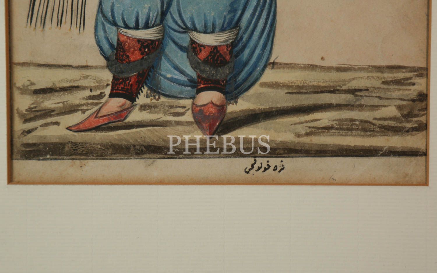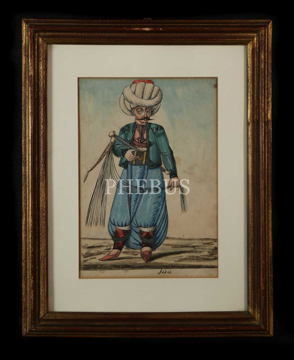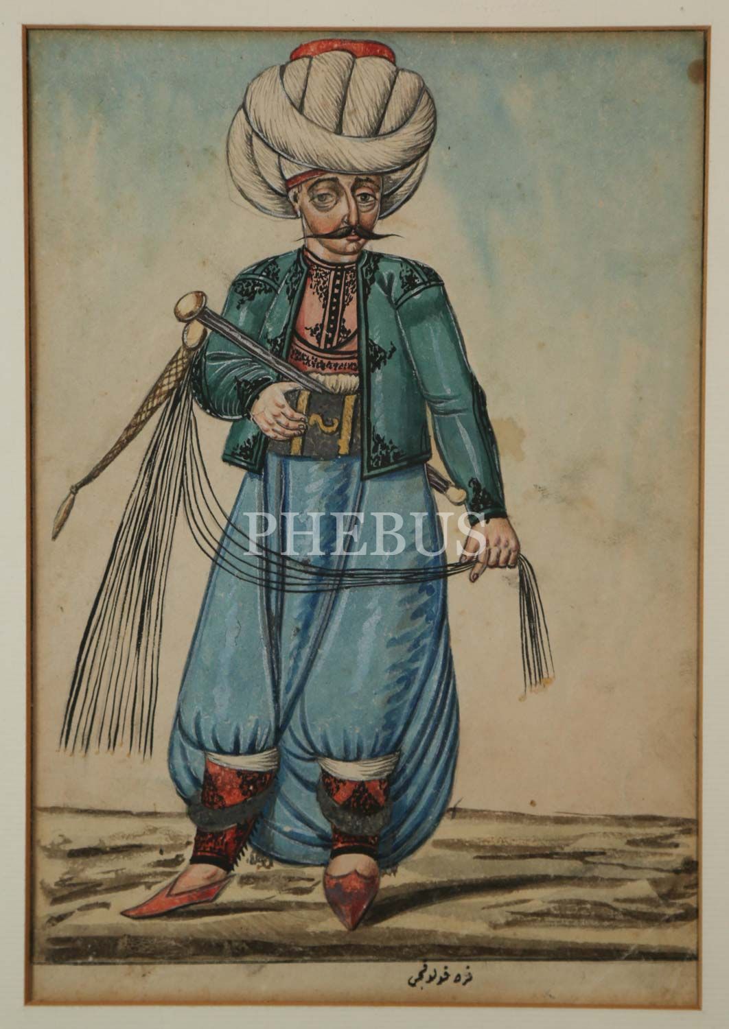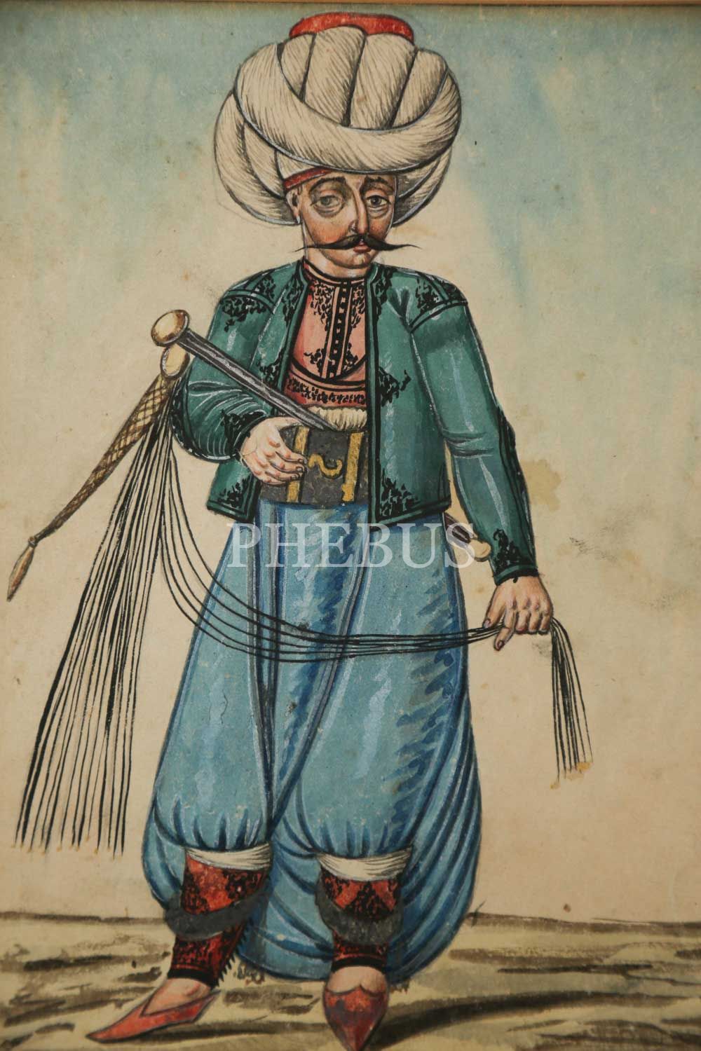 Sultan II. Mahmud devrinin askeri ve sivil devlet erkanını ayrıntılı bir şekilde resmetmesiyle tanınan Fenerci Mehmed´in Osmanlıca "Aşçıbaşının Sakisi" başlıklı, elle renklendirilmiş orijinal çizim gravürü, çerçevesiyle birlikte 30x38 cm...