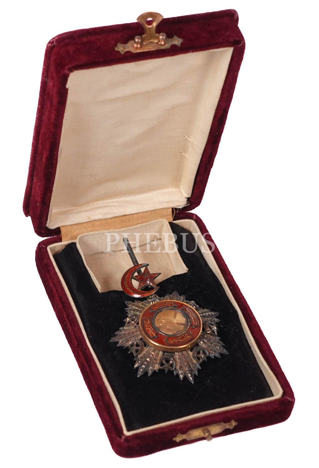 Osmanlı tuğralı orijinal kadife kutusunda 3. Derece Mecidi Nişanı, nişan 5x5 cm, kutu 14x9x3 cm...