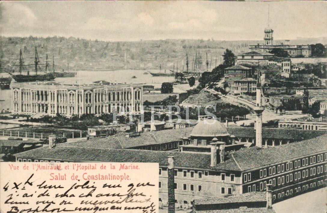 Kasımpaşa Deniz Hastanesi ve Amirallik, "Vue de l´amiraute et l´Hopital de la marine, Salut de Constantinople", pullu ve postadan geçmiş, İstanbul, 14x9 cm...