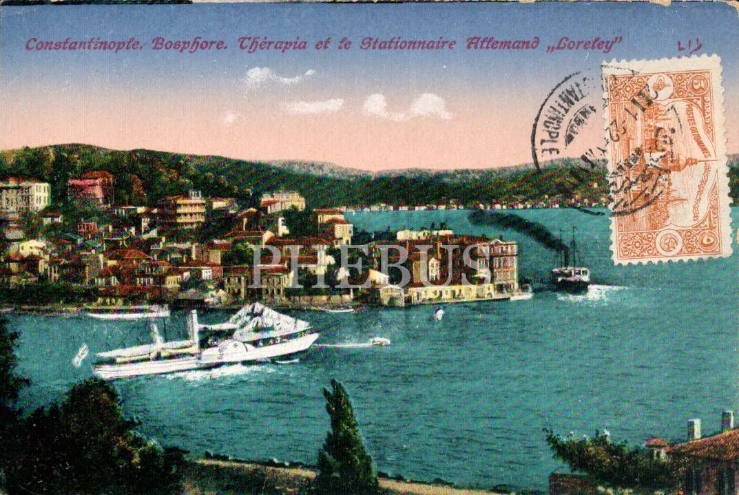 Trabya Manzarası, "Constantinople, Bosphore Therapia et le Stationnaire Affemand Loreley", Osmanlıca "Trabya" yazılı, ed.: M. J. C., pullu ve postadan geçmiş, İstanbul, 14x9 cm...