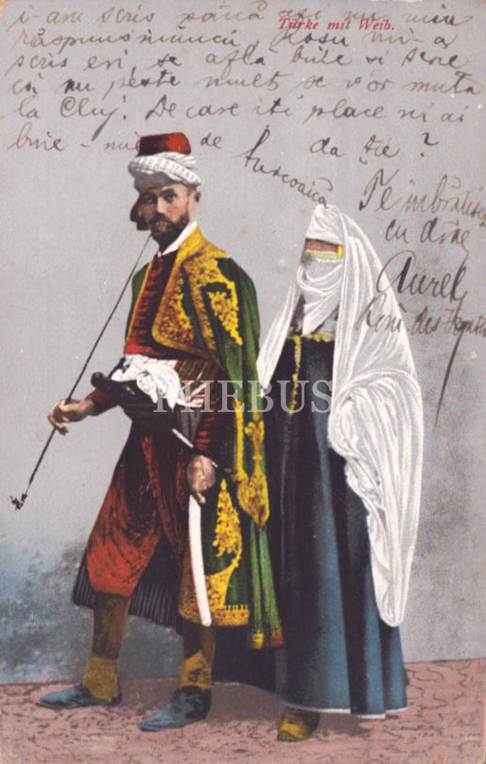 Dönemsel kıyafetler içerisinde Osmanlı beyefendi ve hanımefendi, "Türke mit Weib", postadan geçmiş, 14x9 cm...