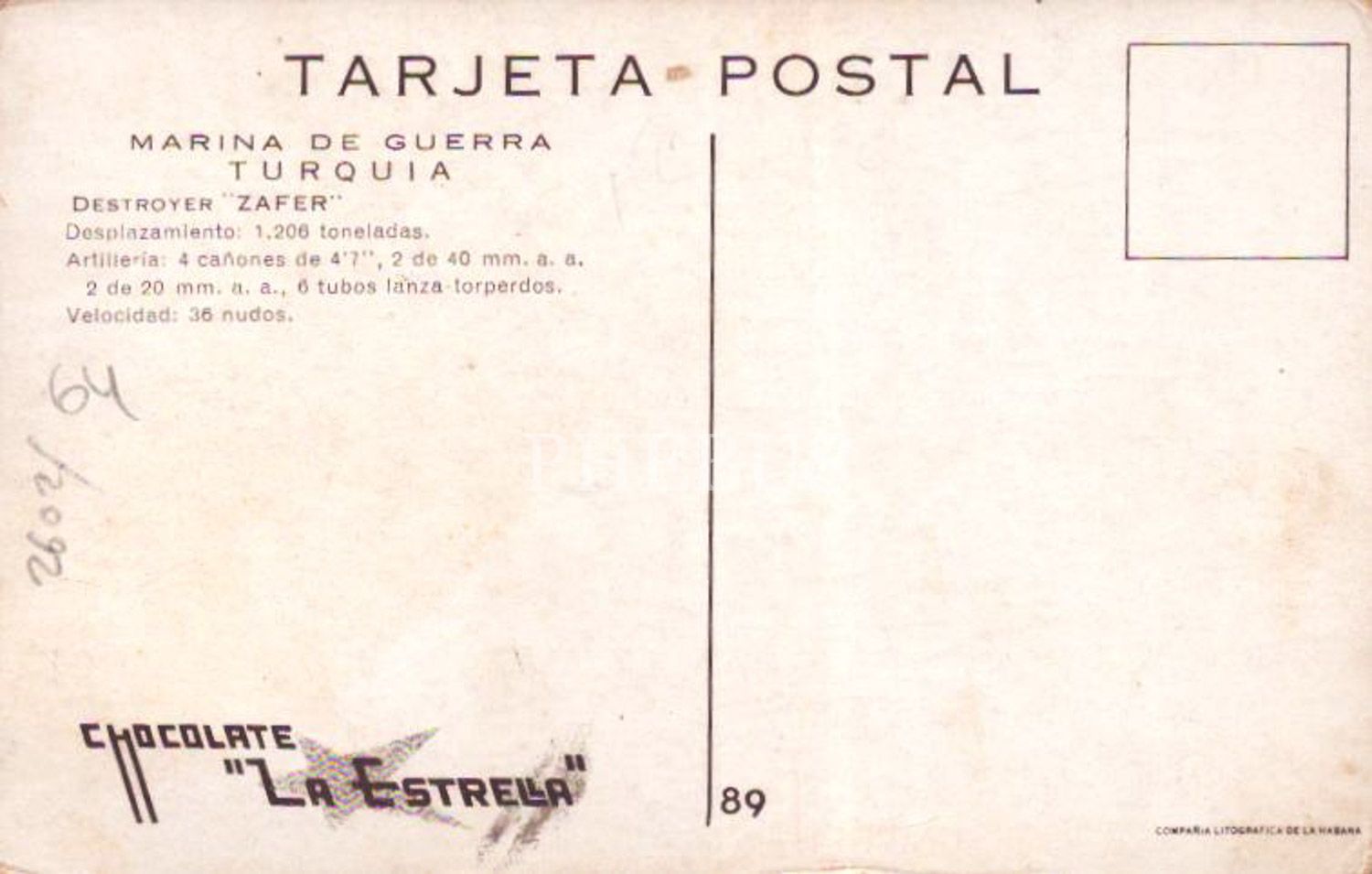Zafer Zırhlısı, arka yüzünde Fransızca zırhlının özellikleri yazılı ve "La Estrella" çikolatası reklamı yer alan kartpostal, 14x9 cm...