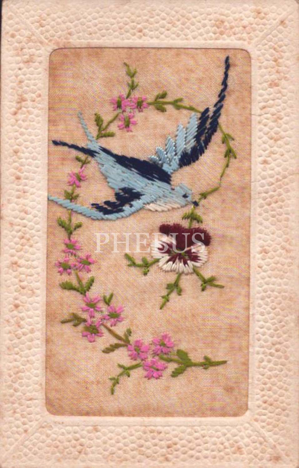 Kanaviçe kuş ve çiçek motifli, arka yüzünde 9 Haziran 1921 tarihli Osmanlıca mektup yer alan bayram tebrik kartı, 14x9 cm...