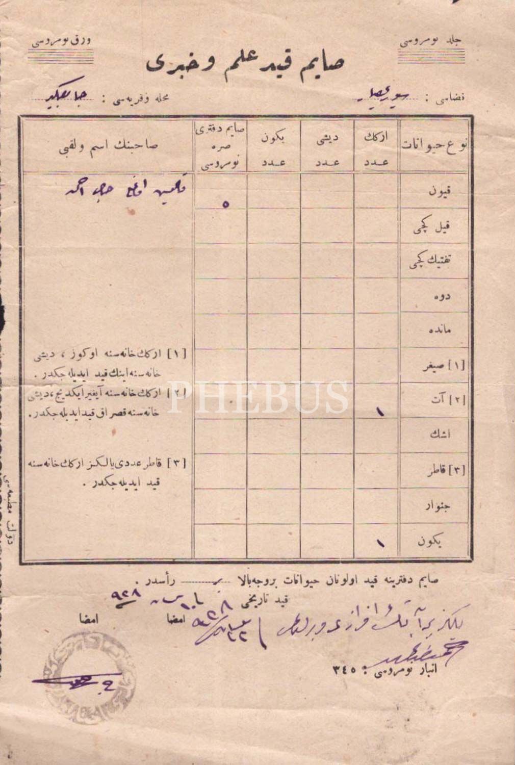 Hacı Ahmet Efendi´nin 5 adet koyununa ait hayvan sayım belgesi, 1928, 14x20 cm...