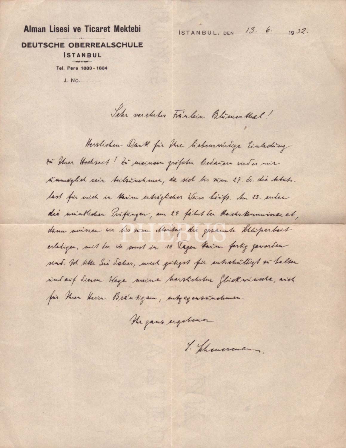 Alman Lisesi ve Ticaret Mektebi "Deutsche Oberrealshule İstanbul" antetli 13 Haziran 1932 tarihli Almanca dilekçe, 23x30 cm...