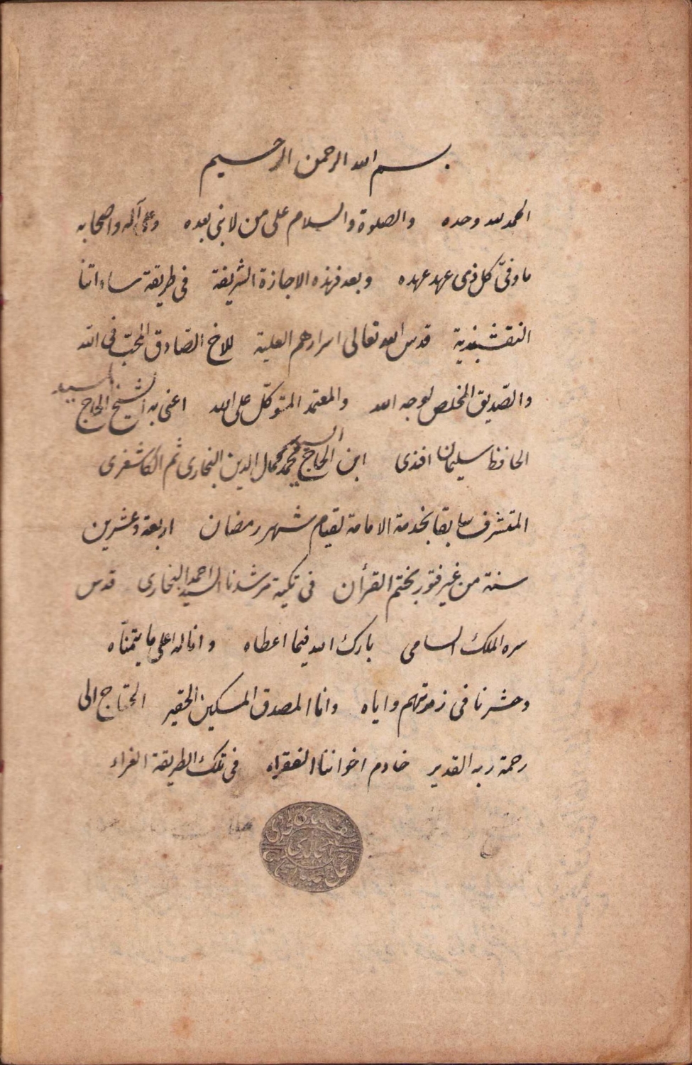 Tarikat icazetnamesi, Seyyid Niyazi ibn Mustafa'dan Hacı Hafız Süleyman Eyyubi'ye, 1319 tarihli,