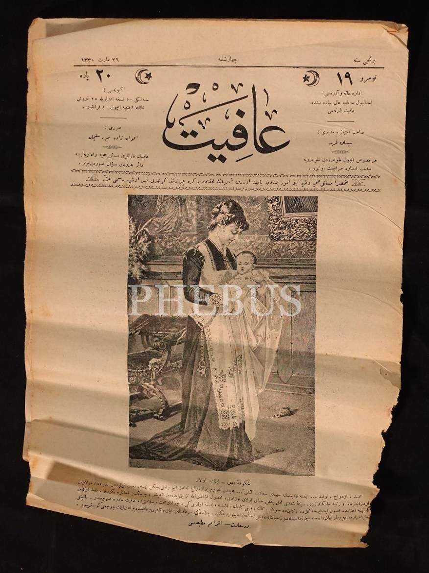 Kapağında "Şüke-i Amal- İlk Evlad" başlıklı görselin yer aldığı AFİYET dergisinin 19 numaralı sayısı, 26 Mart 1330, İstanbul İkdam Matbaası, 8 sayfa, 25x37 cm...