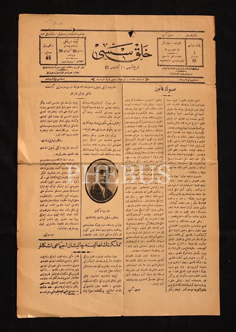 "Hariciye Vekili Tevfik Rüştü Beyefendi ile Mösyö Mussolini arasında tadi edilen telgraflar" manşetli HALK SESİ gazetesi, 4 Haziran 1928, 4 sayfa, 31x47 cm....