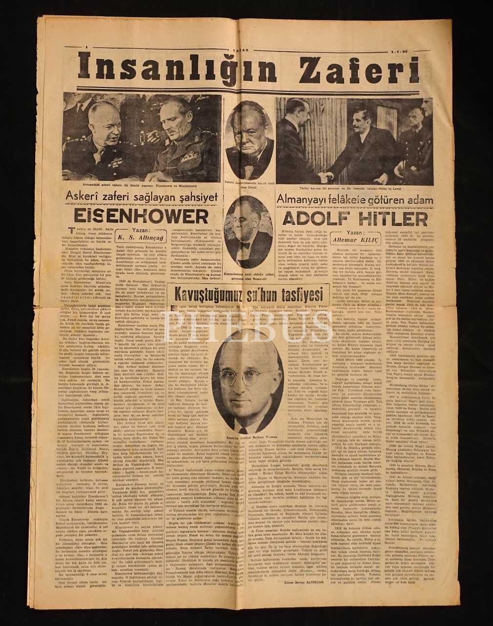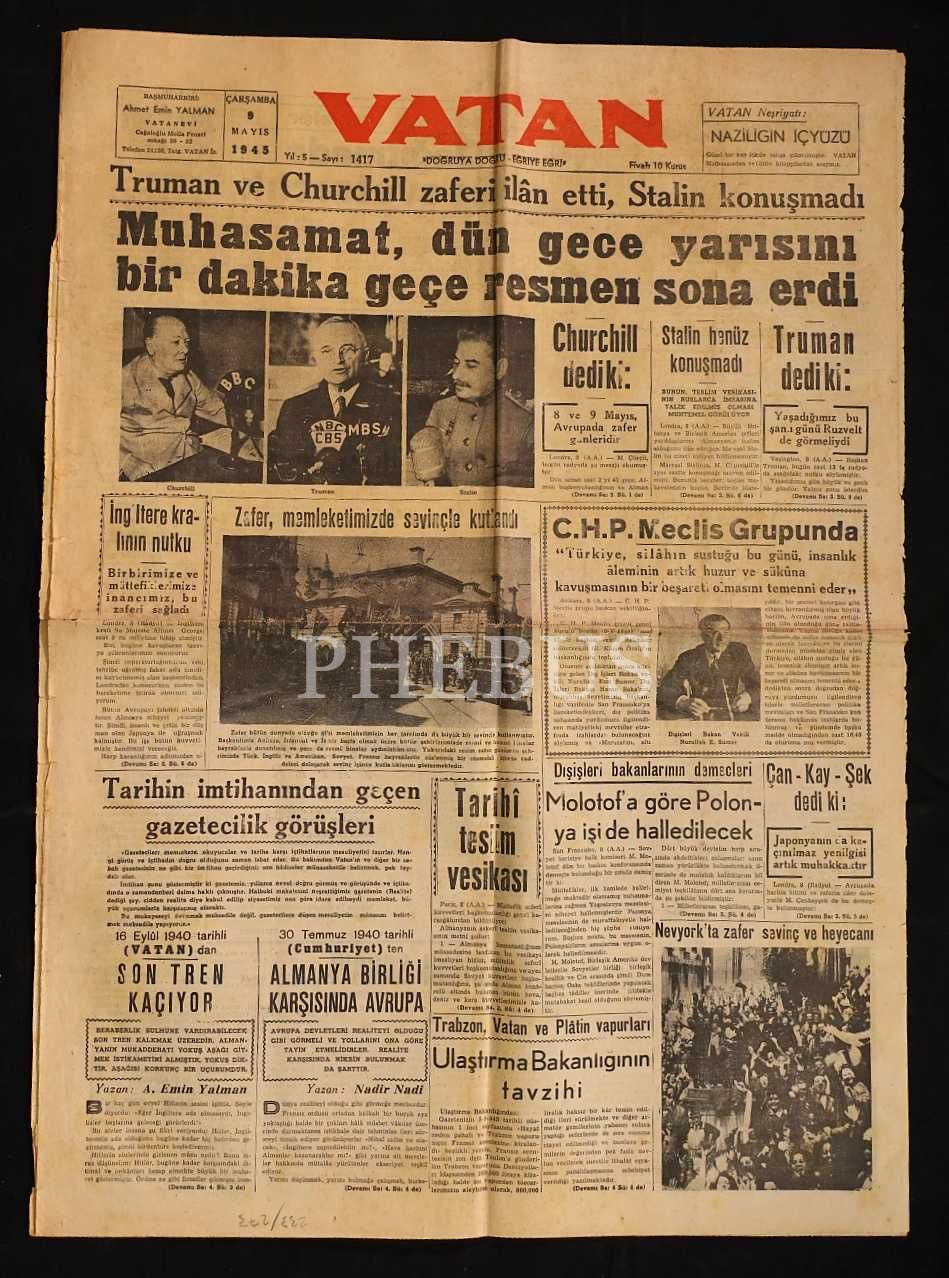 "Muhasamat, Dün Gece Yarısını Bir Dakika Geçe Resmen Sona Erdi" manşetli, İkinci Dünya Savaşı´nın bitişi konulu VATAN gazetesi, 9 Mayıs 1945, 6 sayfa, 42x58 cm...