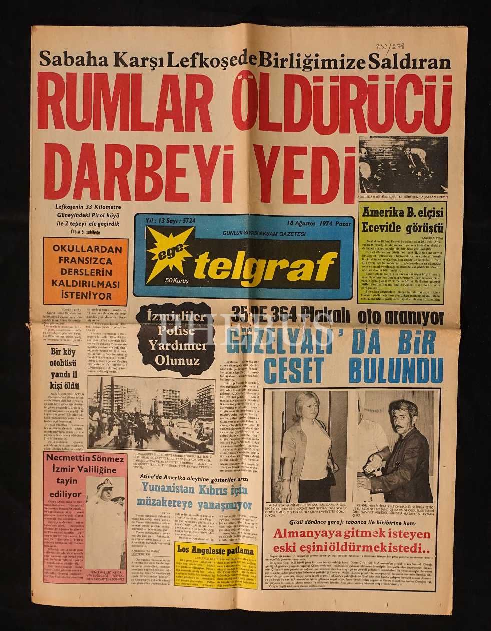 "Sabaha Karşı Lefkoşede Birliğimize Saldıran Rumlar Öldürücü Darbeyi Yedi" manşetli EGE TELGRAF gazetesi, 6 sayfa, 42x58 cm...