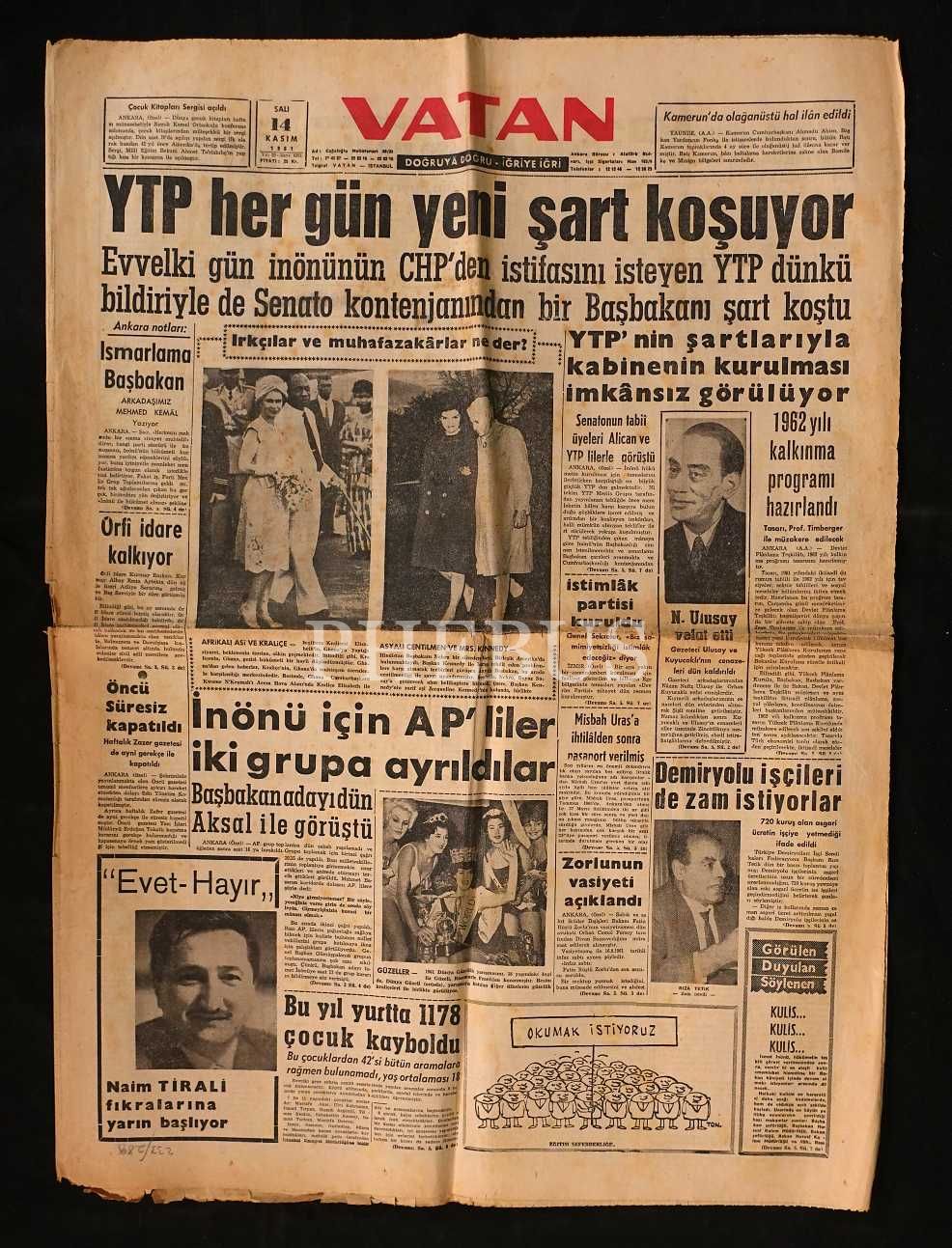 "YTP Her Gün Yeni Şart Koşuyor" manşetli, YTP´nin yeni kabine şartları konulu VATAN gazetesi, 14 Kasım 1961, 6 sayfa, 42x58 cm...