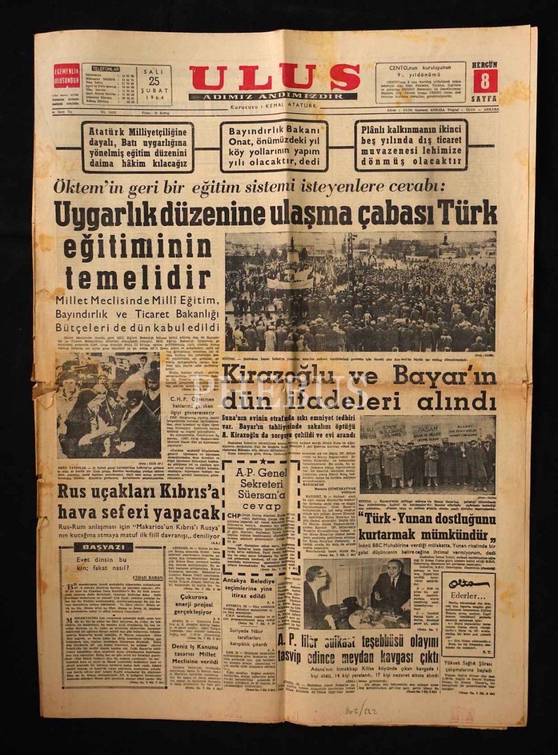 "Uygarlık Düzenine Ulaşma Çabası Türk Eğitiminin Temelidir" manşetli ULUS gazetesi, 25 Şubat 1964, 8 sayfa, 48x58 cm...
