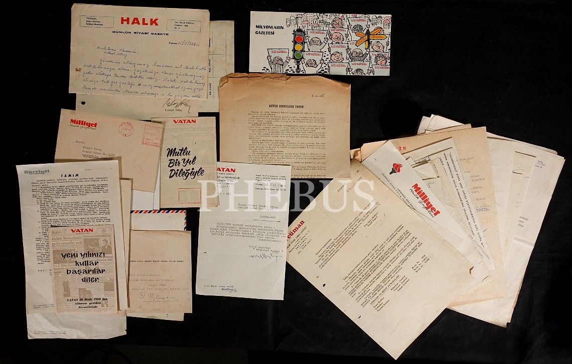 Gazeteci, araştırmacı, karikatürist ve yazar Hikmet Aksoy´a muhabiri olduğu ve muhabiri olmak istediği muhtelif gazeteler tarafından gönderilen mektuplar, zarflarve bayram tebrik kartları...