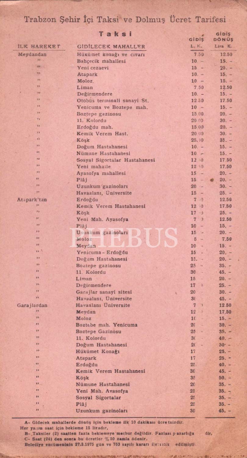 Trabzon Şehir İçi Taksi ve Dolmuş Ücret Tarifesi, 17x32 cm...
