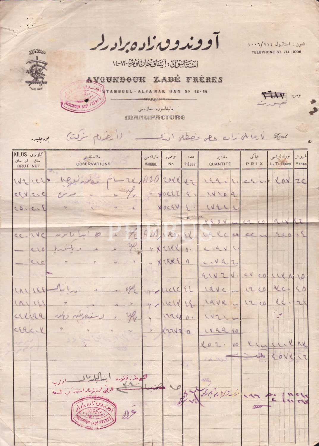 Avunduk Zade Biraderler Manifatura Mağazası´na ait Osmanlıca ve Fransızca, pullu ve damgalı fatura, 32x23 cm...