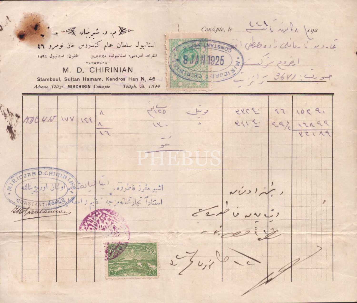 M. D. Şirinyan Şirketi´ne ait 1925 tarihli Osmanlıca ve Fransızca, pullu ve damgalı fatura, 22x19 cm...