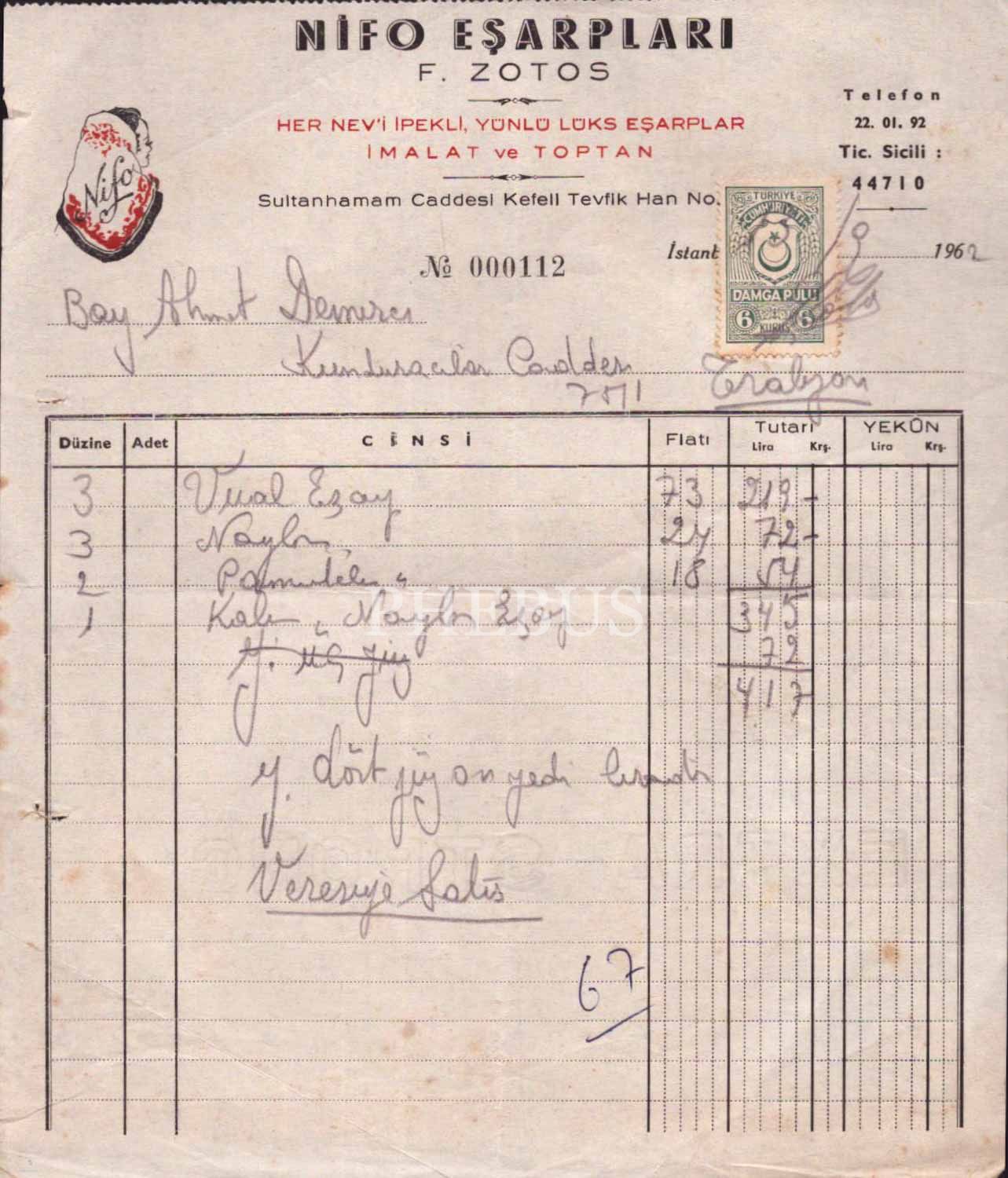 Nifo Eşarpları F.Zotos´a ait 1962 tarihli pullu ve damgalı fatura, 20x22 cm...