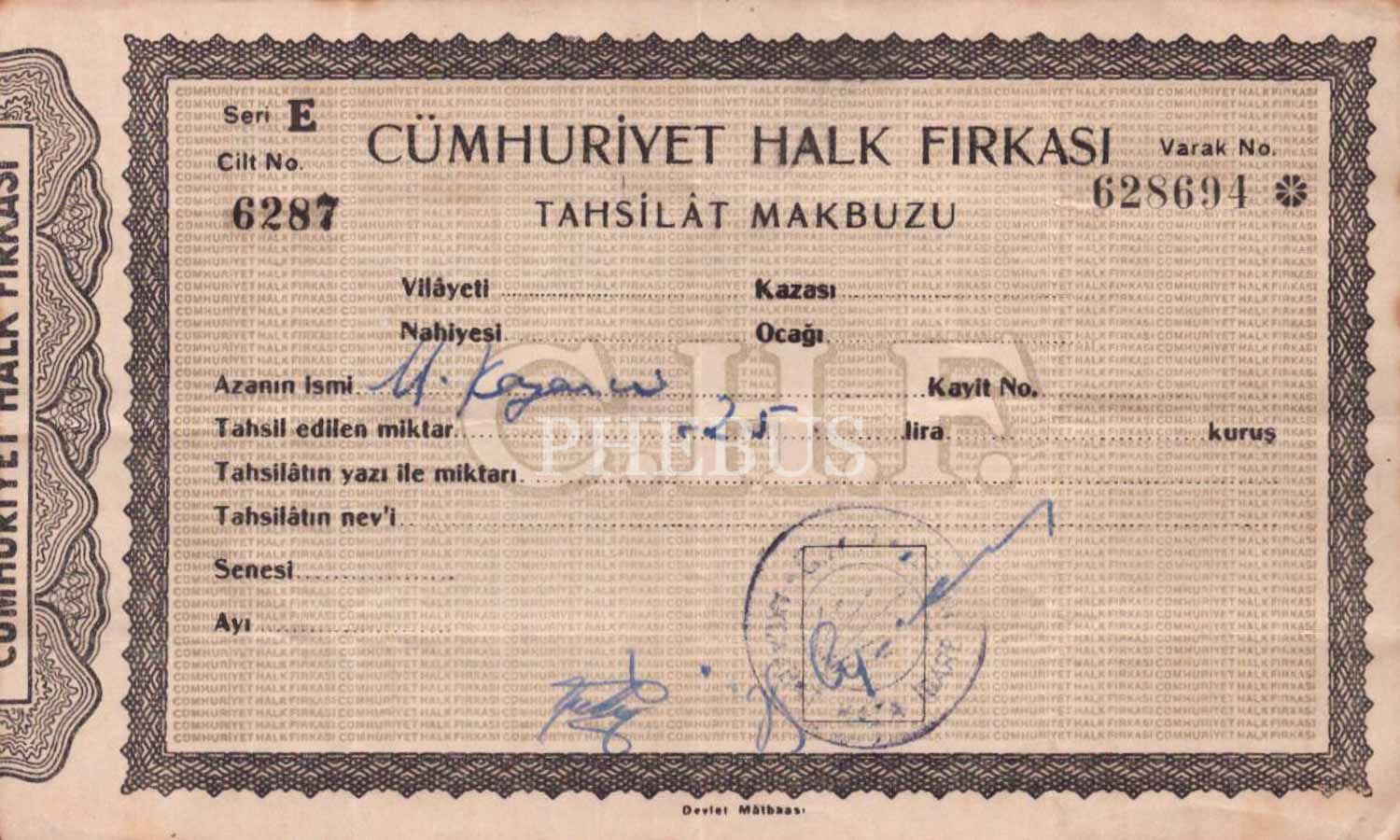 Türkiye Cumhuriyet Halk Fırkası Tahsilat Makbuzu, 20x12 cm...