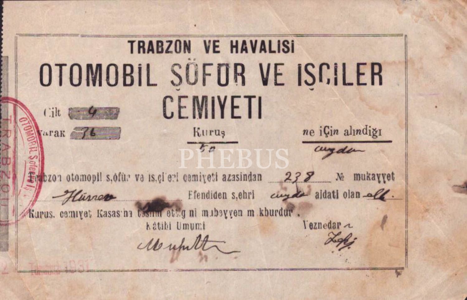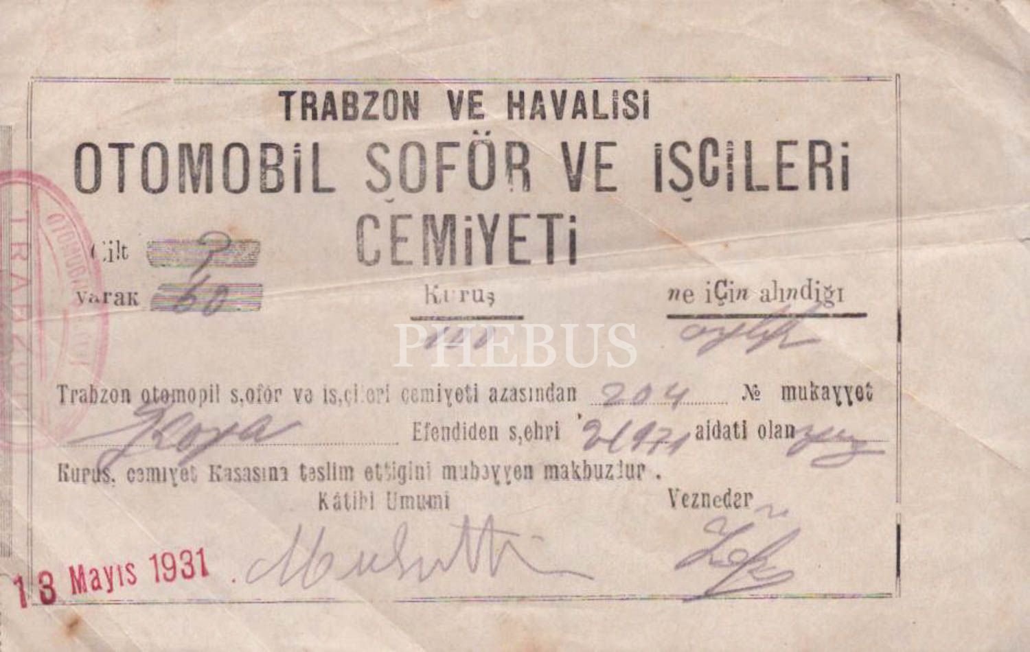 Trabzon ve Havalisi Otomobil Şoför ve İşçileri Cemiyeti antetli 2 adet 13 Mayıs 1931 tarihli aidat makbuzu, 16x10 cm...