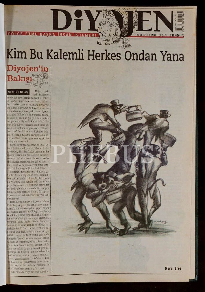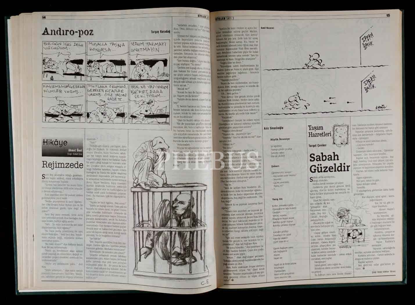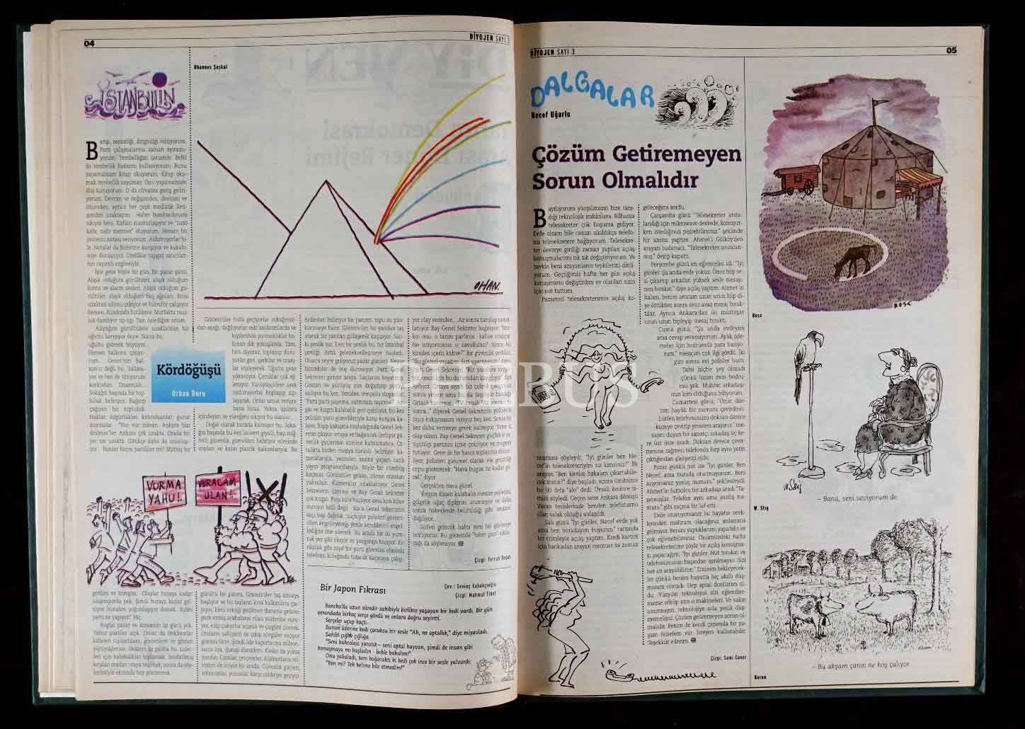 DİYOJEN mizah dergisinin 7 Mart 1998 - 18 Nisan 1998 tarihleri arasında yayınlanan ilk 7 sayısını ihtiva eden cilt, 29x41 cm...