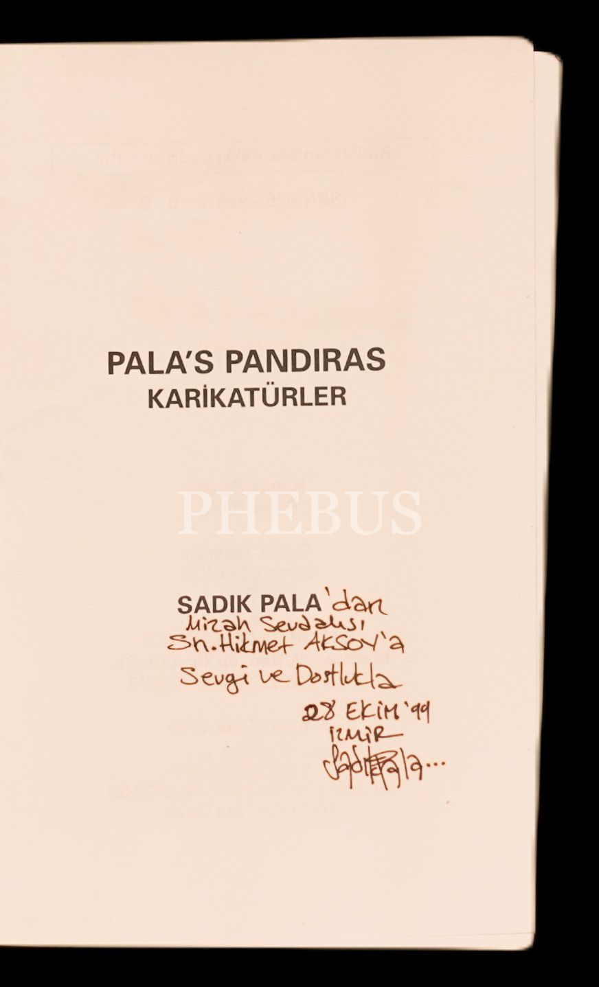 İthaf, "Sadık Pala´dan mizah sevdalısı Sn. Hikmet Aksoy´a sevgi ve dostlukla. 28 Ekim ´99 İzmir, Sadık Pala" şeklindedir.
