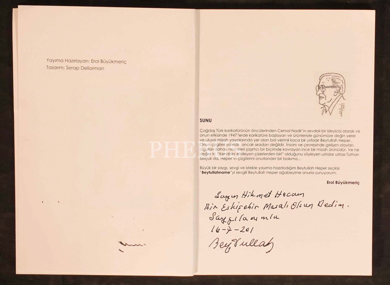 İthaf, "Sayın Hikmet Hocam, Bir Eskişehir masalı olsun dedim. Saygılarımla. 16-7-2001, Beytullah" şeklindedir.